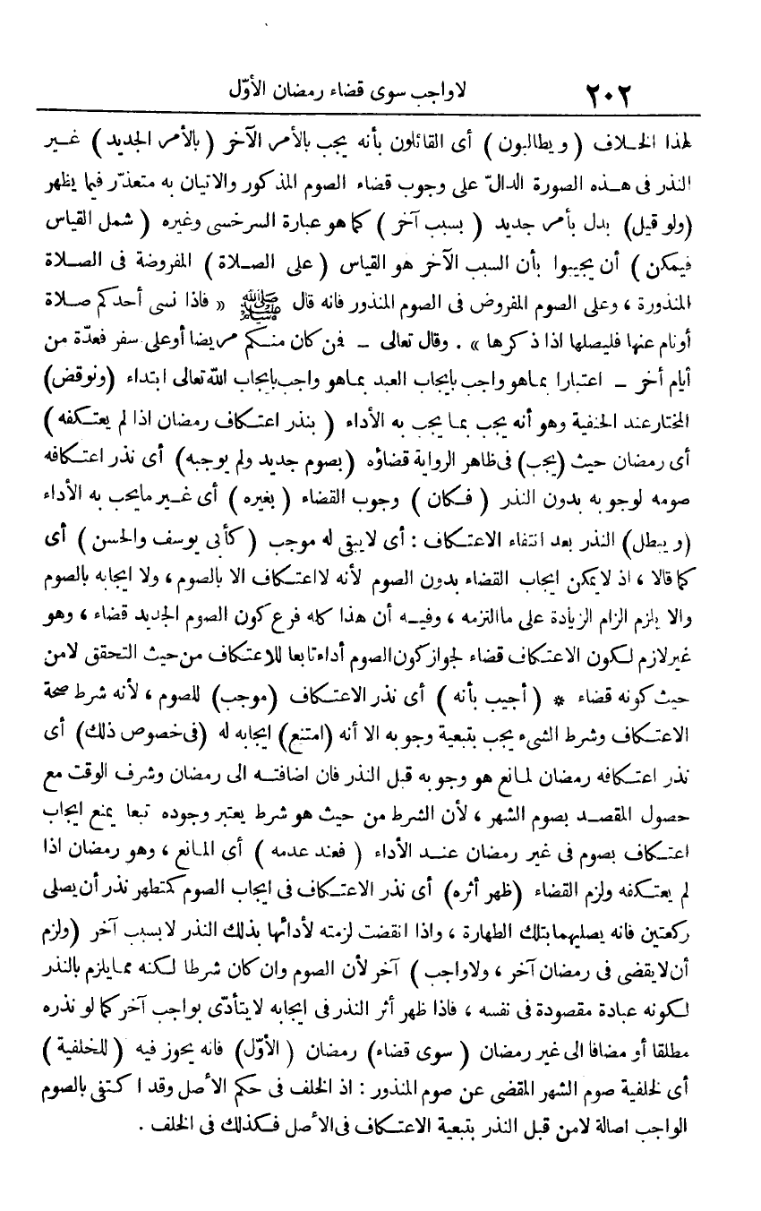 لهَذَا الْخلاف (ويطالبون) أَي الْقَائِلُونَ بِأَنَّهُ يجب بِالْأَمر الآخر (بِالْأَمر الْجَدِيد) غير النّذر فِي هَذِه الصُّورَة الدَّال على وجوب قَضَاء الصَّوْم الْمَذْكُور والإتيان بِهِ مُتَعَذر فِيمَا يظْهر (وَلَو قيل) بدل بِأَمْر جَدِيد (بِسَبَب آخر) كَمَا هُوَ عبارَة السَّرخسِيّ وَغَيره (شَمل الْقيَاس فَيمكن) أَن يجيبوا بِأَن السَّبَب الآخر هُوَ الْقيَاس (على الصَّلَاة) الْمَفْرُوضَة فِي الصَّلَاة الْمَنْذُورَة، وعَلى الصَّوْم الْمَفْرُوض فِي الصَّوْم الْمَنْذُور فَإِنَّهُ قَالَ صلى الله عَلَيْهِ وَسلم " فَإِذا نسى أحدكُم صَلَاة أَو نَام عَنْهَا فليصلها إِذا ذكرهَا ". وَقَالَ تَعَالَى - {فَمن كَانَ مِنْكُم مَرِيضا أَو على سفر فَعدَّة من أَيَّام أخر} - اعْتِبَارا بِمَا هُوَ وَاجِب بِإِيجَاب العَبْد بِمَا هُوَ وَاجِب بِإِيجَاب الله تَعَالَى ابْتِدَاء (ونوقض) الْمُخْتَار عِنْد الْحَنَفِيَّة وَهُوَ أَنه يجب بِمَا يجب بِهِ الْأَدَاء (بِنذر اعْتِكَاف رَمَضَان إِذا لم يعتكفه) أَي رَمَضَان حَيْثُ (يجب) فِي ظَاهر الرِّوَايَة قَضَاؤُهُ (بِصَوْم جَدِيد وَلم يُوجِبهُ) أَي نذر اعْتِكَافه صَوْمه لوُجُوبه بِدُونِ النّذر (فَكَانَ) وجوب الْقَضَاء (بِغَيْرِهِ) أَي غير مَا يحب بِهِ الْأَدَاء (وَيبْطل) النّذر بعد انْتِفَاء الِاعْتِكَاف: أَي لَا يبْقى لَهُ مُوجب (كَأبي يُوسُف وَالْحسن) أَي كَمَا قَالَا، إِذْ لَا يُمكن إِيجَاب الْقَضَاء بِدُونِ الصَّوْم لِأَنَّهُ لَا اعْتِكَاف إِلَّا بِالصَّوْمِ، وَلَا إِيجَابه بِالصَّوْمِ وَإِلَّا يلْزم إِلْزَام الزِّيَادَة على مَا الْتَزمهُ، وَفِيه أَن هَذَا كُله فرع كَون الصَّوْم الْجَدِيد قَضَاء، وَهُوَ غير لَازم لكَون الِاعْتِكَاف قَضَاء لجَوَاز كَون الصَّوْم أَدَاء تَابعا للاعتكاف من حَيْثُ التحقق لَا من حَيْثُ كَونه قَضَاء (أُجِيب بِأَنَّهُ) أَي نذر الِاعْتِكَاف (مُوجب) للصَّوْم، لِأَنَّهُ شَرط صِحَة الِاعْتِكَاف وَشرط الشَّيْء يجب بتبعية وُجُوبه إِلَّا أَنه (امْتنع) إِيجَابا لَهُ (فِي خُصُوص ذَلِك) أَي نذر اعْتِكَافه رَمَضَان لمَانع هُوَ وُجُوبه قبل النّذر فَإِن إِضَافَته إِلَى رَمَضَان وَشرف الْوَقْت مَعَ حُصُول الْمَقْصد بِصَوْم الشَّهْر، لِأَن الشَّرْط من حَيْثُ هُوَ شَرط يعْتَبر وجوده تبعا يمْنَع إِيجَاب اعْتِكَاف بِصَوْم فِي غير رَمَضَان عِنْد الْأَدَاء (فَعِنْدَ عَدمه) أَي الْمَانِع، وَهُوَ رَمَضَان إِذا لم يعتكفه وَلزِمَ الْقَضَاء (ظهر أَثَره) أَي نذر الِاعْتِكَاف فِي إِيجَاب الصَّوْم كمظهر نذر أَن يُصَلِّي رَكْعَتَيْنِ فَإِنَّهُ يُصليهَا بِتِلْكَ الطَّهَارَة، وَإِذا انْقَضتْ لَزِمته لأدائها بذلك النّذر لَا بِسَبَب آخر (وَلزِمَ أَن لَا يقْضِي فِي رَمَضَان آخر، وَلَا وَاجِب) آخر لِأَن الصَّوْم وَإِن كَانَ شرطا لكنه مِمَّا يلْزم بِالنذرِ لكَونه عبَادَة مَقْصُودَة فِي نَفسه، فَإِذا ظهر أثر النّذر فِي إِيجَابه لَا يتَأَدَّى بِوَاجِب آخر كَمَا لَو نَذره مُطلقًا أَو مُضَافا إِلَى غير رَمَضَان (سوى قَضَاء) رَمَضَان (الأول) فَإِنَّهُ يجوز فِيهِ (للخلفية) أَي لخلفية صَوْم الشَّهْر الْمقْضِي عَن صَوْم الْمَنْذُور: إِذْ الْخلف فِي حكم الأَصْل وَقد اكْتفى بِالصَّوْمِ الْوَاجِب أَصَالَة لَا من قبل النّذر بتبعية الِاعْتِكَاف فِي الأَصْل فَكَذَلِك فِي الْخلف.
