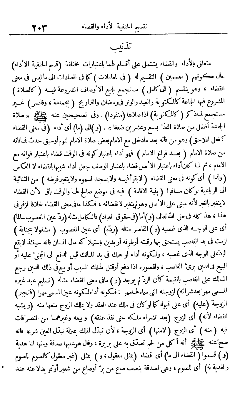 مُتَعَلق بِالْأَدَاءِ وَالْقَضَاء يشْتَمل على أَقسَام لَهما باعتبارات مُخْتَلفَة (قسم الْحَنَفِيَّة الْأَدَاء) حَال كَونهم (معممين) التَّقْسِيم لَهُ (فِي الْمُعَامَلَات) كَمَا فِي الْعِبَادَات إِلَى مَا لَيْسَ فِي معنى الْقَضَاء، وَهُوَ يَنْقَسِم (إِلَى كَامِل) مستجمع لجَمِيع الْأَوْصَاف المشروعية فِيهِ (كَالصَّلَاةِ) الْمَشْرُوع فِيهَا الْجَمَاعَة كالمكتوبة والعيد وَالْوتر فِي رَمَضَان والتراويح (بِجَمَاعَة، وقاصر) غير مستجمع لما ذكر (كالمكتوبة) إِذْ صلاهَا (مُنْفَردا). وَفِي الصَّحِيحَيْنِ عَنهُ صلى الله عَلَيْهِ وَسلم " صَلَاة الْجَمَاعَة أفضل من صَلَاة الْفَذ بِسبع وَعشْرين ضعفا ". (و) إِلَى (مَا) أَي أَدَاء (فِي معنى الْقَضَاء كَفعل اللَّاحِق) وَهُوَ من فَاتَهُ بعد مَا دخل مَعَ الإِمَام بعض صَلَاة الإِمَام لنوم أَو سبق حدث فَمَا فَاتَهُ من صَلَاة الإِمَام (بعد فرَاغ الإِمَام) فَهُوَ أَدَاء بِاعْتِبَار كَونه فِي الْوَقْت قَضَاء بِاعْتِبَار فَوَاته مَعَ الإِمَام، ثمَّ لما كَانَ أَدَاء بِاعْتِبَار الأَصْل قَضَاء بِاعْتِبَار الْوَصْف جعل أَدَاء شَبِيها بِالْقضَاءِ لَا الْعَكْس (وَلذَا) أَي كَونه فِي معنى الْقَضَاء (لَا يقْرَأ فِيهِ وَلَا يسْجد لسَهْوه وَلَا يتَغَيَّر فَرْضه) من الثنائية إِلَى الرّبَاعِيّة لَو كَانَ مُسَافِرًا (بنية الْإِقَامَة) فِيهِ فِي مَوضِع صَالح لَهَا وَالْوَقْت بَاقٍ لِأَن الْقَضَاء لَا يتَغَيَّر بِالْغَيْر لِأَنَّهُ مَبْنِيّ على الأَصْل وَهُوَ لم يتَغَيَّر لانقضائه، فَكَذَا مَا فِي معنى الْقَضَاء خلافًا لزفَر فِي هَذَا، هَذَا كُله فِي حق الله تَعَالَى (و) أما (فِي حُقُوق الْعباد) فالكامل مِثَاله (رد عين الْمَغْصُوب سالما) أَي على الْوَجْه الَّذِي غصبه (و) الْقَاصِر مِثَاله (رده) أَي عين الْمَغْصُوب (مَشْغُولًا بِجِنَايَة) لَزِمت فِي يَد الْغَاصِب يسْتَحق بهَا رقبته أَو طرفه أَو بدين استهلاكه مَال إِنْسَان فَإِنَّهُ حِينَئِذٍ لَا يَقع الرَّد على الْوَجْه الَّذِي غصبه، ولكونه أَدَاء لَو هلك فِي يَد الْمَالِك قبل الدّفع إِلَى الْمَجْنِي عَلَيْهِ أَو البيع فِي الدّين برِئ الْغَاصِب، ولقصوره إِذا دفع أَو قتل بذلك السَّبَب أَو بيع فِي ذَلِك الدّين رَجَعَ الْمَالِك على الْغَاصِب بِالْقيمَةِ كَأَن الرَّد لم يُوجد (و) مَا فِي معنى الْقَضَاء مِثَاله (تَسْلِيم عب د غَيره الْمُسَمّى مهْرا بعد شِرَائِهِ) لزوجته الَّتِي سَمَّاهُ لَهَا مهْرا: فكونه أَدَاء لكَونه عين الْمُسَمّى مهْرا (فتجبر) الزَّوْجَة (عَلَيْهِ) أَي على قبُوله كَمَا لَو كَانَ فِي ملك عِنْد العقد وَلَا يملك الزَّوْج منعهَا مِنْهُ (وَيُشبه الْقَضَاء لِأَنَّهُ) أَي الزَّوْج (بعد الشِّرَاء ملكه حَتَّى نفذ عتقه) وَبيعه وَغَيرهمَا من التَّصَرُّفَات فِيهِ (مِنْهُ) أَي الزَّوْج (لَا مِنْهَا) أَي الزَّوْجَة، لِأَن تبدل الْملك بِمَنْزِلَة تبدل الْعين شرعا فَإِنَّهُ صَحَّ عَنهُ صلى الله عَلَيْهِ وَسلم أَنه أكل من لحم تصدق بِهِ على بَرِيرَة، وَقَالَ هُوَ عَلَيْهَا صَدَقَة وَمِنْهَا لنا هَدِيَّة (و) قسموا (الْقَضَاء إِلَى مَا) أَي قَضَاء (بِمثل مَعْقُول، و) بِمثل (غير مَعْقُول كَالصَّوْمِ للصَّوْم والفدية لَهُ) أَي للصَّوْم، وَهِي الصَّدَقَة بِنصْف صَاع من بر أَو صَاع من شعير أَو تمر بَدَلا عَنهُ عِنْد