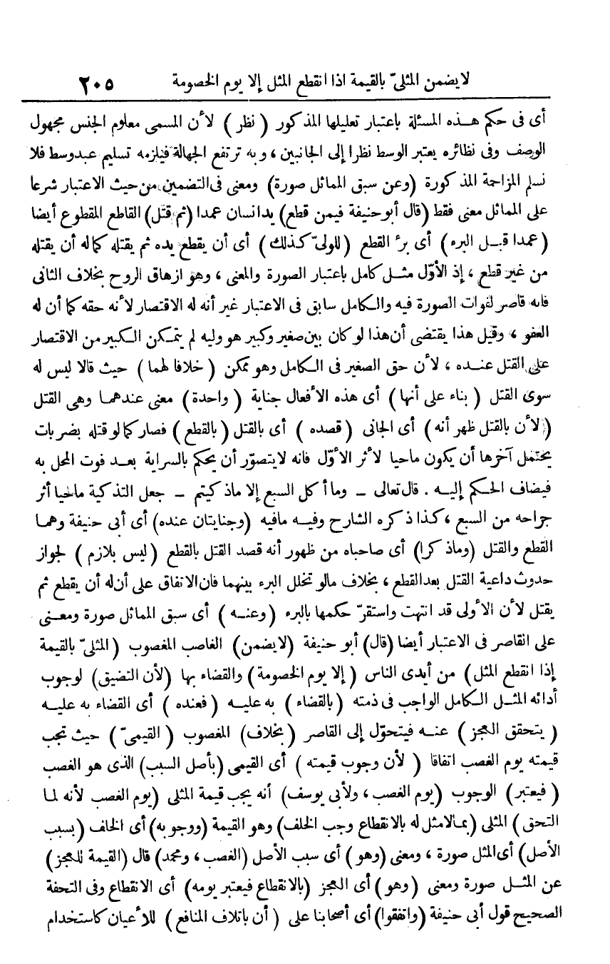 أَي فِي حكم هَذِه المسئلة بِاعْتِبَار تعليلها الْمَذْكُور (نظر) لِأَن الْمُسَمّى مَعْلُوم الْجِنْس مَجْهُول الْوَصْف وَفِي نَظَائِره يعْتَبر الْوسط نظرا إِلَى الْجَانِبَيْنِ، وَبِه ترْتَفع الْجَهَالَة فَيلْزمهُ تَسْلِيم عبد وسط فَلَا نسلم الْمُزَاحمَة الْمَذْكُورَة (وَعَن سبق المماثل صُورَة) وَمعنى فِي التَّضْمِين من حَيْثُ الِاعْتِبَار شرعا على المماثل معنى فَقَط (قَالَ أَبُو حنيفَة فِيمَن قطع) يَد إِنْسَان عمدا (ثمَّ قتل) الْقَاطِع الْمَقْطُوع أَيْضا (عمدا قبل الْبُرْء) أَي برْء الْقطع (للْوَلِيّ كَذَلِك) أَي أَن يقطع يَده ثمَّ يقْتله كَمَا لَهُ أَن يقْتله من غير قطع، إِذْ الأول مثل كَامِل بِاعْتِبَار الصُّورَة وَالْمعْنَى، وَهُوَ إزهاق الرّوح بِخِلَاف الثَّانِي فَإِنَّهُ قَاصِر لفَوَات الصُّورَة فِيهِ والكامل سَابق فِي الِاعْتِبَار غير أَنه لَهُ الِاقْتِصَار لِأَنَّهُ حَقه كَمَا أَن لَهُ الْعَفو، وَقيل هَذَا يَقْتَضِي أَن هَذَا لَو كَانَ بَين صَغِير وكبير هُوَ وليه لم يتَمَكَّن الْكَبِير من الِاقْتِصَار على الْقَتْل عِنْده، لِأَن حق الصَّغِير فِي الْكَامِل وَهُوَ مُمكن (خلافًا لَهما) حَيْثُ قَالَا لَيْسَ لَهُ سوى الْقَتْل (بِنَاء على أَنَّهَا) أَي هَذِه الْأَفْعَال جِنَايَة (وَاحِدَة) معنى عِنْدهمَا وَهِي الْقَتْل (لِأَن بِالْقَتْلِ ظهر أَنه) أَي الْجَانِي (قَصده) أَي بِالْقَتْلِ (بِالْقطعِ) فَصَارَ كَمَا لَو قَتله بضربات يحْتَمل آخرهَا أَن يكون ماحيا لأثر الأول فَإِنَّهُ لَا يتَصَوَّر أَن يحكم بِالسّرَايَةِ بعد فَوت الْمحل بِهِ فيضاف الحكم إِلَيْهِ. قَالَ تَعَالَى - {وَمَا أكل السَّبع إِذا مَا ذكيتم} - جعل التذكية ماحيا أثر جراحه من السَّبع، كَذَا ذكره الشَّارِح وَفِيه مَا فِيهِ (وجنايتان عِنْده) أَي أبي حنفية وهما الْقطع وَالْقَتْل (وَمَا ذكرا) أَي صَاحِبَاه من ظُهُور أَنه قصد الْقَتْل بِالْقطعِ (لَيْسَ بِلَازِم) لجَوَاز حُدُوث دَاعِيَة الْقَتْل بعد الْقطع، بِخِلَاف مَا لَو تخَلّل الْبُرْء بَينهمَا فَإِن الِاتِّفَاق على أَن لَهُ أَن يقطع ثمَّ يقتل لِأَن الأولى قد انْتَهَت وَاسْتقر حكمهَا بالبرء (وَعنهُ) أَي سبق المماثل صُورَة وَمعنى على الْقَاصِر فِي الِاعْتِبَار أَيْضا (قَالَ) أَبُو حنيفَة (لَا يضمن) الْغَاصِب الْمَغْصُوب (الْمثْلِيّ بِالْقيمَةِ إِذا انْقَطع الْمثل) من أَيدي النَّاس (إِلَّا يَوْم الْخُصُومَة) وَالْقَضَاء بهَا (لِأَن التضيق) لوُجُوب أَدَائِهِ الْمثل الْكَامِل الْوَاجِب فِي ذمَّته (بِالْقضَاءِ) بِهِ عَلَيْهِ (فَعنده) أَي الْقَضَاء بِهِ عَلَيْهِ (بتحقق الْعَجز) عَنهُ فيتحول إِلَى الْقَاصِر (بِخِلَاف) الْمَغْصُوب (القيمي) حَيْثُ تجب قِيمَته يَوْم الْغَصْب اتِّفَاقًا (لِأَن وجوب قِيمَته) أَي القيمى (بِأَصْل السَّبَب) الَّذِي هُوَ الْغَصْب (فَيعْتَبر) الْوُجُوب (يَوْم الْغَصْب، وَلأبي يُوسُف) أَنه يجب قيمَة المثلى (يَوْم الْغَصْب لِأَنَّهُ لما الْتحق) المثلى (بِمَا لَا مثل لَهُ بالانقطاع وَجب الْخلف) وَهُوَ الْقيمَة (ووجوبه) أَي الْخلف (بسب الأَصْل) أَي الْمثل صُورَة، وَمعنى (وَهُوَ) أَي سَبَب الأَصْل (الْغَصْب، وَمُحَمّد) قَالَ (الْقيمَة للعجز) عَن الْمثل صُورَة وَمعنى (وَهُوَ) أَي الْعَجز (بالانقطاع فَيعْتَبر يَوْمه) أَي الِانْقِطَاع وَفِي التُّحْفَة الصَّحِيح قَول أبي حنيفَة (وَاتَّفَقُوا) أَي أَصْحَابنَا على (أَن بِإِتْلَاف الْمَنَافِع) للأعيان كاستخدام