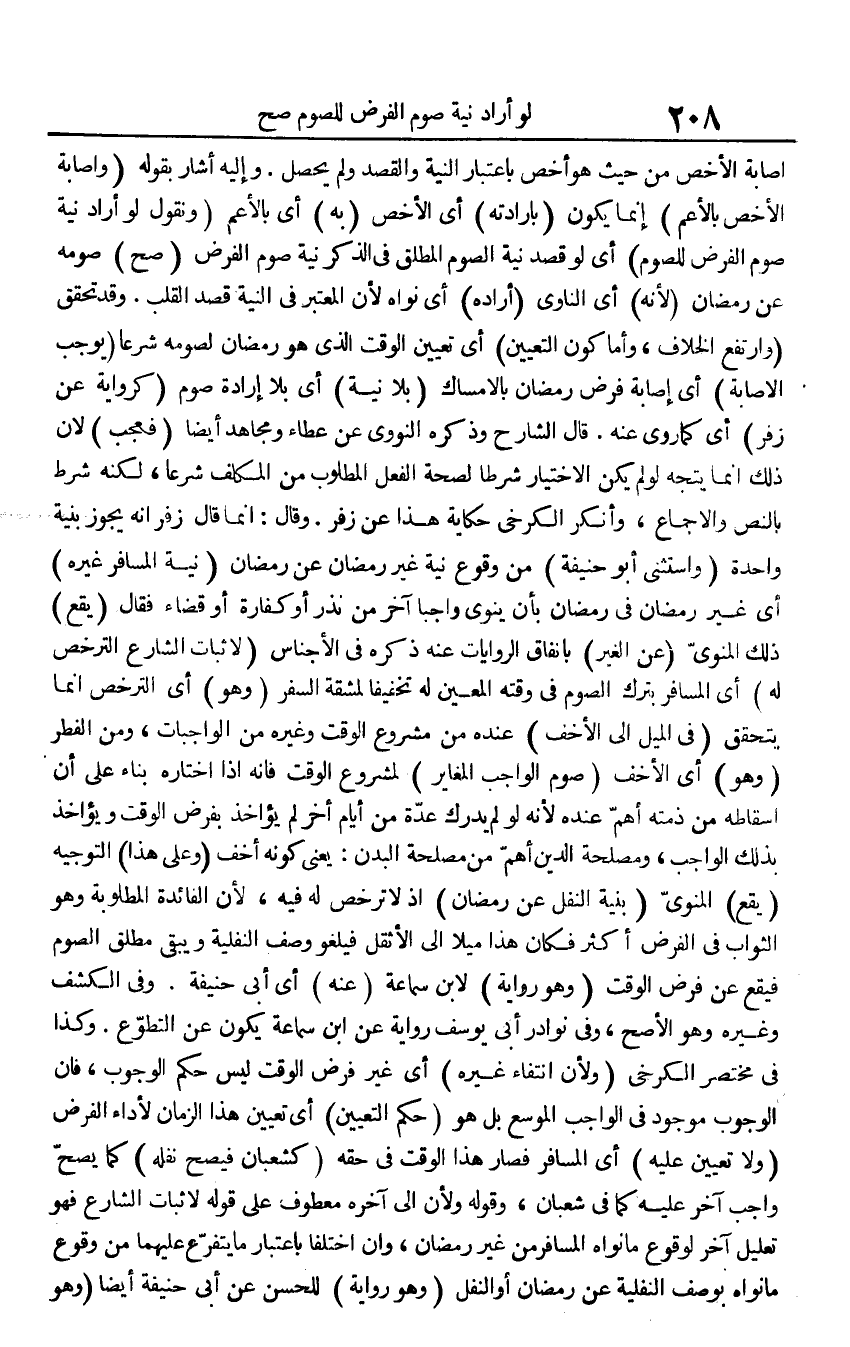 إِصَابَة الْأَخَص من حَيْثُ هُوَ أخص بِاعْتِبَار النِّيَّة وَالْقَصْد وَلم يحصل. وَإِلَيْهِ أَشَارَ بقوله (وإصابة الْأَخَص بالأعم) إِنَّمَا يكون (بإرادته) أَي الْأَخَص (بِهِ) أَي بالأعم (ونقول لَو أَرَادَ نِيَّة صَوْم الْفَرْض للصَّوْم) أَي لَو قصد نِيَّة الصَّوْم الْمُطلق فِي الذّكر نِيَّة صَوْم الْفَرْض (صَحَّ) صَوْمه عَن رَمَضَان (لِأَنَّهُ) أَي الناوي (أَرَادَهُ) أَي نَوَاه لِأَن الْمُعْتَبر فِي النِّيَّة قصد الْقلب. وَقد تحقق (وارتفع الْخلاف، وَأما كَون التَّعْيِين) أَي تعْيين الْوَقْت الَّذِي هُوَ رَمَضَان لصومه شرعا (يُوجب الْإِصَابَة) أَي إِصَابَة فرض رَمَضَان بالإمساك (بِلَا نِيَّة) أَي بِلَا إِرَادَة صَوْم (كَرِوَايَة عَن زفر) أَي كَمَا روى عَنهُ. قَالَ الشَّارِح وَذكره النَّوَوِيّ عَن عَطاء وَمُجاهد أَيْضا (فَعجب) لِأَن ذَلِك إِنَّمَا يتَّجه لَو لم يكن الِاخْتِيَار شرطا لصِحَّة الْفِعْل الْمَطْلُوب من الْمُكَلف شرعا، لكنه شَرط بِالنَّصِّ وَالْإِجْمَاع، وَأنكر الْكَرْخِي حِكَايَة هَذَا عَن زفر. وَقَالَ: إِنَّمَا قَالَ زفر أَنه يجوز بنية وَاحِدَة (وَاسْتثنى أَبُو حنيفَة) من وُقُوع نِيَّة غير رَمَضَان عَن رَمَضَان (نِيَّة الْمُسَافِر غَيره) أَي غير رَمَضَان فِي رَمَضَان بِأَن يَنْوِي وَاجِبا آخر من نذر أَو كَفَّارَة أَو قَضَاء فَقَالَ (يَقع) ذَلِك المنويّ (عَن الْغَيْر) بانفاق الرِّوَايَات عَنهُ ذكره فِي الْأَجْنَاس (لإِثْبَات الشَّارِع التَّرَخُّص لَهُ) أَي الْمُسَافِر بترك الصَّوْم فِي وقته الْمعِين لَهُ تَخْفِيفًا لمَشَقَّة السّفر (وَهُوَ) أَي التَّرَخُّص إِنَّمَا يتَحَقَّق (فِي الْميل إِلَى الأخف) عِنْده من مَشْرُوع الْوَقْت وَغَيره من الْوَاجِبَات، وَمن الْفطر (وَهُوَ) أَي الأخف (صَوْم الْوَاجِب المغاير) لمشروع الْوَقْت فَإِنَّهُ إِذا اخْتَارَهُ بِنَاء على أَن إِسْقَاطه من ذمَّته أهمّ عِنْده لِأَنَّهُ لَو لم يدْرك عدّة من أَيَّام أخر لم يُؤَاخذ بِفَرْض الْوَقْت ويؤاخذ بذلك الْوَاجِب، ومصلحة الدّين أهم من مصلحَة الْبدن: يَعْنِي كَونه أخف (وعَلى هَذَا) التَّوْجِيه (يَقع) المنويّ (بنية النَّفْل عَن رَمَضَان) إِذْ لَا ترخص لَهُ فِيهِ، لِأَن الْفَائِدَة الْمَطْلُوبَة وَهُوَ الثَّوَاب فِي الْفَرْض أَكثر فَكَانَ هَذَا ميلًا إِلَى الأثقل فَيلْغُو وصف النفلية وَيبقى مُطلق الصَّوْم فَيَقَع عَن فرض الْوَقْت (وَهُوَ رِوَايَة) لِابْنِ سَمَّاعَة (عَنهُ) أَي أبي حنيفَة. وَفِي الْكَشْف وَغَيره وَهُوَ الْأَصَح، وَفِي نَوَادِر أبي يُوسُف رِوَايَة عَن ابْن سَمَّاعَة يكون عَن التطوّع. وَكَذَا فِي مُخْتَصر الْكَرْخِي (وَلِأَن انْتِفَاء غَيره) أَي غير فرض الْوَقْت لَيْسَ حكم الْوُجُوب، فَإِن الْوُجُوب مَوْجُود فِي الْوَاجِب الموسع بل هُوَ (حكم التَّعْيِين) أَي تعْيين هَذَا الزَّمَان لأَدَاء الْفَرْض (وَلَا تعْيين عَلَيْهِ) أَي الْمُسَافِر فَصَارَ هَذَا الْوَقْت فِي حَقه (كشعبان فَيصح نفله) كَمَا يَصح وَاجِب آخر عَلَيْهِ كَمَا فِي شعْبَان، وَقَوله وَلِأَن إِلَى آخِره مَعْطُوف على قَوْله لإِثْبَات الشَّارِع فَهُوَ تَعْلِيل آخر لوُقُوع مَا نَوَاه الْمُسَافِر من غير رَمَضَان، وَإِن اخْتلفَا بِاعْتِبَار مَا يتَفَرَّع عَلَيْهِمَا من وُقُوع مَا نَوَاه بِوَصْف النفلية عَن رَمَضَان أَو النَّفْل (وَهُوَ رِوَايَة) لِلْحسنِ عَن أبي حنيفَة أَيْضا (وَهُوَ
