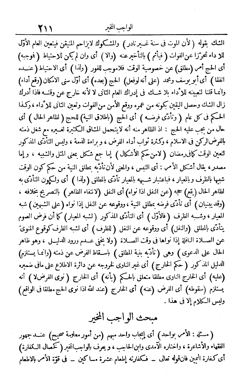 الشَّك بقوله (لِأَن الْمَوْت فِي سنة غير نَادِر) والمشكوك لَا يزاحم الْمُتَيَقن فَيتَعَيَّن الْعَام الأول للْأَدَاء تَحَرُّزًا عَن الْفَوات (فيأثم) بِالتَّأْخِيرِ عَنهُ (وَإِلَّا) أَي وَإِن لم يكن للِاحْتِيَاط (فموجبه) أَي الْحَج أَمر (مُطلق) عَن خُصُوصِيَّة الْوَقْت فَلَا مُوجب للفور (وَلذَا) أَي الِاحْتِيَاط (عِنْده اتفقَا) أَي أَبُو يُوسُف وَمُحَمّد (على أَنه لَو فعل) الْحَج (بعده) أَي أول سني الْإِمْكَان (وَقع أَدَاء) وَإِنَّمَا قُلْنَا لتعيينه للْأَدَاء بِلَا شكّ فِي إِدْرَاك الْعَام الثَّانِي لَا لِأَنَّهُ خَارج عَن وقته فَإِذا أدْرك زَالَ الشَّك وَحصل الْيَقِين بِكَوْنِهِ من عمره وَوَقع الْأَمْن من الْفَوات وَتعين الثَّانِي للْأَدَاء، وَكَذَا الحكم فِي كل عَام (وتأدى فَرْضه) أَي الْحَج (بِإِطْلَاق النِّيَّة) لِلْحَجِّ (لظَاهِر الْحَال) أَي حَال من يجب عَلَيْهِ الْحَج: إِذْ الظَّاهِر مِنْهُ أَنه لَا يتَحَمَّل المشاق الْكَثِيرَة لغيره مَعَ شغل ذمَّته بِالْفَرْضِ الرُّكْن فِي الْإِسْلَام، وَكَثْرَة ثَوَاب أَدَاء الْفَرْض، وَبَرَاءَة الذِّمَّة، وَلَيْسَ التأدى الْمَذْكُور لتعين الْوَقْت كَمَا فِي رَمَضَان (لَا من حكم الأشكال) إِمَّا جمع شكل بِمَعْنى الْمثل والشبيه، وَإِمَّا مصدر، يُقَال أشكل الْأَمر: أَي الْتبس، وَالْمعْنَى لِأَن تأديه بِمُطلق النِّيَّة من حكم كَون الْوَقْت شَبِيها بالظرف وبالمعيار، فباعتبار شبهه بالمعيار تأدى بالمطلق (وَلذَا) أَي وَلكَون التأدى بِهِ لظَاهِر الْحَال (يَقع) حجه (عَن النَّفْل إِذا نَوَاه) أَي النَّفْل (لانْتِفَاء الظَّاهِر) بالتصريح بِخِلَافِهِ، (وَقد يبنيان) أَي تأدى فَرْضه بِمُطلق النِّيَّة، ووقوعه عَن النَّفْل إِذا نَوَاه (على الشبهين) شبه المعيار، وَشبه الظّرْف (فَالْأول) أَي التأدي الْمَذْكُور (لشبه المعيار) كَمَا أَن فرض الصَّوْم يتَأَدَّى بالمطلق (وَالنَّفْل) أَي ووقوعه عَن النَّفْل (للظرف) أَي لشبه الظّرْف كوقوع الْمَنوِي عَن الصَّلَاة النَّافِلَة إِذا نَوَاهَا فِي وَقت الصَّلَاة (وَلَا يخفى عدم وُرُود الدَّلِيل، وَهُوَ ظَاهر الْحَال على الدَّعْوَى) وَهِي (تأديه بنية الْمُطلق) بِإِسْقَاط الْفَرْض عَن ذمَّته (وَإِنَّمَا يسْتَلْزم) الدَّلِيل الْمَذْكُور (حكم الْخَارِج) أَي غير الناوي لِخُرُوجِهِ عَن دَائِرَة الِاطِّلَاع على مَا فِي ضَمِيره (عَلَيْهِ) أَي الْخَارِج الناوي مُطلقًا مُتَعَلق بالحكم (بِأَنَّهُ) أَي الْخَارِج (نوى الْفَرْض لَا) أَنه يسْتَلْزم (سُقُوطه) أَي الْفَرْض (عَنهُ) أَي الْخَارِج (عِنْد الله إِذا نوى الْحَج مُطلقًا فِي الْوَاقِع) وَلَيْسَ الْكَلَام إِلَّا فِي هَذَا.