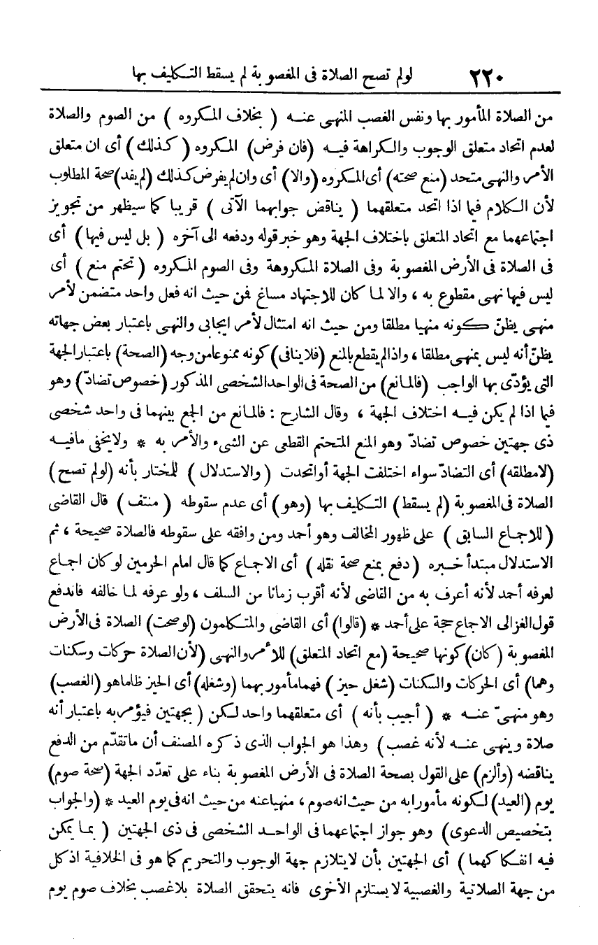 من الصَّلَاة الْمَأْمُور بهَا وَنَفس الْغَصْب الْمنْهِي عَنهُ (بِخِلَاف الْمَكْرُوه) من الصَّوْم وَالصَّلَاة لعدم اتِّحَاد مُتَعَلق الْوُجُوب وَالْكَرَاهَة فِيهِ (فَإِن فرض) الْمَكْرُوه (كَذَلِك) أَي أَن مُتَعَلق الْأَمر وَالنَّهْي مُتحد (منع صِحَّته) أَي الْمَكْرُوه (وَإِلَّا) أَي وَإِن لم يفْرض كَذَلِك (لم يفد) صِحَة الْمَطْلُوب لِأَن الْكَلَام فِيمَا إِذا اتَّحد متعلقهما (يُنَاقض جوابهما الْآتِي) قَرِيبا كَمَا سَيظْهر من تَجْوِيز اجْتِمَاعهمَا مَعَ اتِّحَاد الْمُتَعَلّق باخْتلَاف الْجِهَة وَهُوَ خبر قَوْله وَدفعه إِلَى آخِره (بل لَيْسَ فِيهَا) أَي فِي الصَّلَاة فِي الأَرْض الْمَغْصُوبَة وَفِي الصَّلَاة الْمَكْرُوهَة وَفِي الصَّوْم الْمَكْرُوه (تحتم منع) أَي لَيْسَ فِيهَا نهي مَقْطُوع بِهِ، وَإِلَّا لما كَانَ للِاجْتِهَاد مساغ فَمن حَيْثُ أَنه فعل وَاحِد مُتَضَمّن لأمر مَنْهِيّ يظنّ كَونه مَنْهِيّا مُطلقًا وَمن حَيْثُ أَنه امْتِثَال لأمر إيجابي وَالنَّهْي بِاعْتِبَار بعض جهاته يظنّ أَنه لَيْسَ بمنهي مُطلقًا، وَإِذا لم يقطع بِالْمَنْعِ (فَلَا يُنَافِي) كَونه مَمْنُوعًا من وَجه (الصِّحَّة) بِاعْتِبَار الْجِهَة الَّتِي يُؤَدِّي بهَا الْوَاجِب (فالمانع) من الصِّحَّة فِي الْوَاحِد الشخصي الْمَذْكُور (خُصُوص تضَاد) وَهُوَ فِيمَا إِذا لم يكن فِيهِ اخْتِلَاف الْجِهَة، وَقَالَ الشَّارِح: فالمانع من الْجمع بَينهمَا فِي وَاحِد شخصي ذِي جِهَتَيْنِ خُصُوص تضَاد وَهُوَ الْمَنْع المتحتم الْقطعِي عَن الشَّيْء وَالْأَمر بِهِ وَلَا يخفى مَا فِيهِ (لَا مطلقه) أَي التضاد سَوَاء اخْتلفت الْجِهَة أَو اتّحدت (وَالِاسْتِدْلَال) للمختار بِأَنَّهُ (لَو لم تصح) الصَّلَاة فِي الْمَغْصُوبَة (لم يسْقط) التَّكْلِيف بهَا (وَهُوَ) أَي عدم سُقُوطه (مُنْتَفٍ) قَالَ القَاضِي (للْإِجْمَاع السَّابِق) على ظُهُور الْمُخَالف وَهُوَ أَحْمد وَمن وَافقه على سُقُوطه فَالصَّلَاة صَحِيحَة، ثمَّ الِاسْتِدْلَال مُبْتَدأ خَبره (دفع بِمَنْع صِحَة نَقله) أَي الْإِجْمَاع كَمَا قَالَ إِمَام الْحَرَمَيْنِ لَو كَانَ إِجْمَاع لعرفه أَحْمد لِأَنَّهُ أعرف بِهِ من القَاضِي لِأَنَّهُ أقرب زَمَانا من السّلف، وَلَو عرفه لما خَالفه فَانْدفع قَول الْغَزالِيّ الْإِجْمَاع حجَّة على أَحْمد (قَالُوا) أَي القَاضِي والمتكلمون (لَو صحت) الصَّلَاة فِي الأَرْض الْمَغْصُوبَة (كَانَ) كَونهَا صَحِيحَة (مَعَ اتِّحَاد الْمُتَعَلّق) لِلْأَمْرِ وَالنَّهْي (لِأَن الصَّلَاة حركات وسكنات وهما) أَي الحركات والسكنات (شغل حيّز) فهما مَأْمُور بهما (وشغله) أَي الحيز ظلما هُوَ (الْغَصْب) وَهُوَ مَنْهِيّ عَنهُ (أُجِيب بِأَنَّهُ) أَي متعلقهما وَاحِد لَكِن (بجهتين فَيُؤْمَر بِهِ بِاعْتِبَار أَنه صَلَاة وَينْهى عَنهُ لِأَنَّهُ غصب) وَهَذَا هُوَ الْجَواب الَّذِي ذكره المُصَنّف أَن مَا تقدم من الدّفع يناقضه (وألزم) على القَوْل بِصِحَّة الصَّلَاة فِي الأَرْض الْمَغْصُوبَة بِنَاء على تعدد الْجِهَة (صِحَة صَوْم) يَوْم (الْعِيد) لكَونه مَأْمُورا بِهِ حَيْثُ أَنه صَوْم، مَنْهِيّا عَنهُ من حَيْثُ أَنه فِي يَوْم الْعِيد (وَالْجَوَاب بتخصيص الدَّعْوَى) وَهُوَ جَوَاز اجْتِمَاعهمَا فِي الْوَاحِد الشخصي فِي ذى الْجِهَتَيْنِ (بِمَا يُمكن فِيهِ انفكاكهما أَي الْجِهَتَيْنِ بِأَن لَا يتلازم جِهَة الْوُجُوب وَالتَّحْرِيم كَمَا هُوَ فِي الخلافية إِذْ كل من جِهَة الصلاتية والغصبية لَا يسْتَلْزم الْأُخْرَى فَإِنَّهُ يتَحَقَّق الصَّلَاة بِلَا غصب بِخِلَاف صَوْم يَوْم