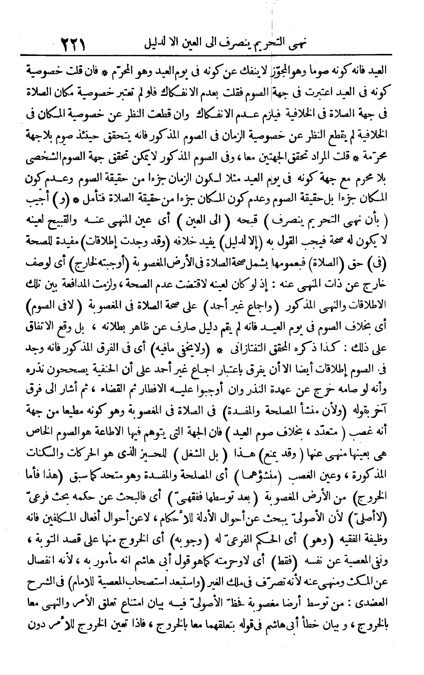 الْعِيد فَإِنَّهُ كَونه صوما وَهُوَ المجوز لَا يَنْفَكّ عَن كَونه فِي يَوْم الْعِيد وَهُوَ الْمحرم فَإِن قلت خُصُوصِيَّة كَونه فِي الْعِيد اعْتبرت فِي جِهَة الصَّوْم فَقلت بِعَدَمِ الانفكاك فَلَو لم تعْتَبر خُصُوصِيَّة مَكَان الصَّلَاة فِي جِهَة الصَّلَاة فِي الخلافية فَيلْزم عدم الانفكاك وَإِن قطعت النّظر عَن خُصُوصِيَّة الْمَكَان فِي الخلافية لم يقطع النّظر عَن خُصُوصِيَّة الزَّمَان فِي الصَّوْم الْمَذْكُور فَإِنَّهُ يتَحَقَّق حِينَئِذٍ صَوْم بِلَا جِهَة مُحرمَة قلت المُرَاد تحقق الْجِهَتَيْنِ مَعًا، وَفِي الصَّوْم الْمَذْكُور لَا يُمكن تحقق جِهَة الصَّوْم الشخصي بِلَا محرم مَعَ جِهَة كَونه فِي يَوْم الْعِيد مثلا لكَون الزَّمَان جُزْءا من حَقِيقَة الصَّوْم وَعدم كَون الْمَكَان جُزْءا بل حَقِيقَة الصَّوْم وَعدم كَون الْمَكَان جُزْءا من حَقِيقَة الصَّلَاة فَتَأمل (و) أُجِيب (بِأَن نهي التَّحْرِيم ينْصَرف) قبحه (إِلَى الْعين) أَي عين الْمنْهِي عَنهُ والقبيح لعَينه لَا يكون لَهُ صِحَة فَيجب القَوْل بِهِ (إِلَّا لدَلِيل) يُفِيد خِلَافه (وَقد وجدت إطلاقات) مفيدة للصِّحَّة (فِي) حق (الصَّلَاة) فبعمومها يَشْمَل صِحَة الصَّلَاة فِي الأَرْض الْمَغْصُوبَة (أوجبته لخارج) أَي لوصف خَارج عَن ذَات الْمنْهِي عَنهُ: إِذْ لَو كَانَ لعَينه لاقتضت عدم الصِّحَّة، ولزمت المدافعة بَين تِلْكَ الإطلاقات وَالنَّهْي الْمَذْكُور (وَإِجْمَاع غير أَحْمد) على صِحَة الصَّلَاة فِي الْمَغْصُوبَة (لَا فِي الصَّوْم) أَي بِخِلَاف الصَّوْم فِي يَوْم الْعِيد فَإِنَّهُ لم يقم دَلِيل صَارف عَن ظَاهر بُطْلَانه، بل وَقع الِاتِّفَاق على ذَلِك: كَذَا ذكره الْمُحَقق التَّفْتَازَانِيّ (وَلَا يخفى مَا فِيهِ) أَي فِي الْفرق الْمَذْكُور فَإِنَّهُ وجد فِي الصَّوْم إطلاقات أَيْضا إِلَّا أَن يفرق بِاعْتِبَار إِجْمَاع غير أَحْمد على أَن الْحَنَفِيَّة يصححون نَذره وَأَنه لَو صَامَهُ خرج عَن عُهْدَة النّذر وَإِن أوجبوا عَلَيْهِ الْإِفْطَار ثمَّ الْقَضَاء، ثمَّ أَشَارَ إِلَى فرق آخر بقوله (وَلِأَن منشأ الْمصلحَة والمفسدة) فِي الصَّلَاة فِي الْمَغْصُوبَة وَهُوَ كَونه مُطيعًا من جِهَة أَنه غصب (مُتَعَدد، بِخِلَاف صَوْم الْعِيد) فَإِن الْجِهَة الَّتِي يتَوَهَّم فِيهَا الإطاعة هُوَ الصَّوْم الْخَاص هِيَ بِعَينهَا مَنْهِيّ عَنْهَا (وَقد يمْنَع) هَذَا (بل الشّغل) للحيز الَّذِي هُوَ الحركات والسكنات الْمَذْكُورَة، وَعين الْغَصْب (منشؤهما) أَي الْمصلحَة والمفسدة وَهُوَ مُتحد كَمَا سبق (هَذَا فَأَما الْخُرُوج) من الأَرْض الْمَغْصُوبَة (بعد توسطها ففقهي) أَي فالبحث عَن حكمه بحث فرعي (لَا أُصَلِّي) لِأَن الأصولي يبْحَث عَن أَحْوَال الْأَدِلَّة للْأَحْكَام، لَا عَن أَحْوَال أَفعَال الْمُكَلّفين فَإِنَّهُ وَظِيفَة الْفَقِيه (وَهُوَ) أَي الحكم الفرعي لَهُ (وُجُوبه) أَي الْخُرُوج مِنْهَا على قصد التَّوْبَة، وَنفي الْمعْصِيَة عَن نَفسه (فَقَط) أَي لَا وحرمته كَمَا هُوَ قَول أبي هَاشم أَنه مَأْمُور بِهِ، لِأَنَّهُ انْفِصَال عَن الْمكْث ومنهي عَنهُ لِأَنَّهُ تصرف فِي ملك الْغَيْر (واستبعد اسْتِصْحَاب الْمعْصِيَة للْإِمَام) فِي الشَّرْح العضدي: من توَسط أَرضًا مَغْصُوبَة فحط الأصولي فِيهِ بَيَان امْتنَاع تعلق الْأَمر وَالنَّهْي مَعًا بِالْخرُوجِ، وَبَيَان خطأ أبي هَاشم فِي قَوْله بتعلقهما مَعًا بِالْخرُوجِ، فَإِذا تعين الْخُرُوج لِلْأَمْرِ دون