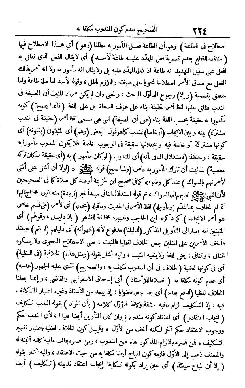 اصْطِلَاح فِي الطَّاعَة) وَهُوَ أَن الطَّاعَة فعل الْمَأْمُور بِهِ مُطلقًا (وَهُوَ) أَي هَذَا الِاصْطِلَاح فِيهَا (مُنْتَفٍ للْقطع بِعَدَمِ تَسْمِيَة فعل المهدد عَلَيْهِ طَاعَة لأحد) أَي لَا يُقَال للْفِعْل الَّذِي تعلق بِهِ افْعَل على سَبِيل التهديد أَنه طَاعَة إِذا فعله المهدد عَلَيْهِ بل وَلَا يُقَال أَنه مَأْمُور بِهِ وَلَا أَنه أَمر بذلك الْفِعْل مَعَ صدق الْأَمر اصْطِلَاحا نحويا على صيغته وَاللَّازِم بَاطِل، وَقَوله لأحد إِمَّا صلَة طَاعَة وَإِمَّا مُتَعَلق بِتَسْمِيَة (وَإِلَّا) رُجُوع إِلَى أول الْبَحْث، وَالْمعْنَى وَإِن لم يكن مُرَاد الْمُثبت أَن الصِّيغَة فِي النّدب يُطلق عَلَيْهَا لفظ أَمر حَقِيقَة بِنَاء على عرف النُّحَاة بل على اللُّغَة (فَإِنَّمَا يَصح) كَونه مَأْمُورا بِهِ حَقِيقَة بِحَسب اللُّغَة بِنَاء (على أَن الصِّيغَة) الَّتِي هِيَ مُسَمّى لفظ أَمر (حَقِيقَة فِي النّدب مُشْتَركا) بَينه وَبَين الْإِيجَاب (أَو خَاصّا) للنَّدْب كَمَا هُوَ قَول الْبَعْض (وهم) أَي المثبتون (ينفونه) أَي كَونهَا مُشْتَركَة أَو خَاصَّة فِيهِ ويجعلونها حَقِيقَة فِي الْوُجُوب خَاصَّة فَلَا يكون الْمَنْدُوب مَأْمُورا بِهِ حَقِيقَة، وَحِينَئِذٍ (فاستدلال النَّافِي بِأَنَّهُ) أَي الْمَنْدُوب (لَو كَانَ مَأْمُورا) بِهِ (أَي حَقِيقَة لَكَانَ تَركه مَعْصِيّة) لما ثَبت أَن تَارِك الْمَأْمُور بِهِ عَاص (وَلما صَحَّ) قَوْله صلى الله عَلَيْهِ وَسلم " (لَوْلَا أَن أشق على أمتِي لأمرتهم بِالسِّوَاكِ) عِنْد كل وضوء " كَمَا فِي صَحِيح ابْن خُزَيْمَة أَو عِنْد كل صَلَاة كَمَا فِي الصَّحِيحَيْنِ لِأَن النَّبِي صلى الله عَلَيْهِ وَسلم ندبهم إِلَى السِّوَاك، ثمَّ قَوْله اسْتِدْلَال النَّافِي مُبْتَدأ خبر (زِيَادَة) مِنْهُ غَيره مُحْتَاج إِلَيْهَا لتَمام الْمَطْلُوب بِمَا تقدم (وتأويله) لفظ الْأَمر فِي الحَدِيث وَمَا قبله (بِحمْلِهِ) أَي الْأَمر (على قسم خَاص هُوَ أَمر الْإِيجَاب) كَمَا ذكره ابْن الْحَاجِب وَغَيره مُخَالفَة للظَّاهِر (بِلَا دَلِيل، وَقَوْلهمْ) أَي المثبتين أَنه يُصَار إِلَى التَّأْوِيل الْمَذْكُور (لدليلنا) مَدْفُوع لِأَنَّهُ (ظهر أَنه) أَي دليلهم (لم يتم) حِينَئِذٍ فأخف الْأَمريْنِ على المثلين جعل الْخلاف لفظيا فالمثبت: يَعْنِي الِاصْطِلَاح النَّحْوِيّ وَلَا يُنكره النَّافِي، والنافي: يَعْنِي اللُّغَة وَلَا يَنْفِيه الْمُثبت، وَإِلَيْهِ أَشَارَ بقوله (وَمثل هَذِه) الخلافية (فِي اللفظية) أَي فِي كَونهَا لفظية (الْخلاف فِي أَن الْمَنْدُوب مُكَلّف بِهِ، وَالصَّحِيح) الَّذِي عَلَيْهِ الْجُمْهُور (عَدمه) أَي عدم كَونه مُكَلّفا بِهِ (خلافًا للأستاذ) أبي إِسْحَاق الاسفرايني وَالْقَاضِي، وَإِنَّمَا جعلنَا الْخلاف لفظيا (لدفع بعده) أَي بعد جعله معنويا: إِذْ يبعد من الْأُسْتَاذ وَغَيره اعْتِبَار التَّكْلِيف فِيهِ: إِذْ التَّكْلِيف إِلْزَام مَا فِيهِ مشقة وكلفة فيؤول كَلَامه (بِأَن المُرَاد) بقوله النّدب تَكْلِيف (إِيجَاب اعْتِقَاده) أَي اعْتِقَاد كَونه مَنْدُوبًا، وَإِن كَانَ التَّأْوِيل أَيْضا بَعيدا، لِأَن النّدب حكم وَوُجُوب الِاعْتِقَاد حكم آخر لكنه أخف من الأول، وَقيل كَون الْخلاف لفظيا بِاعْتِبَار تَفْسِير التَّكْلِيف، فَمن فسره بالإلزام الْمَذْكُور نَفَاهُ عَن الْمَنْدُوب، وَمن فسره بِطَلَب مَا فِيهِ كلفه أثْبته لَهُ وَالْمُصَنّف ذهب إِلَى الأول فَلَزِمَهُ كَون الْمُبَاح أَيْضا مُكَلّفا بِهِ من حَيْثُ الِاعْتِقَاد، وَإِلَيْهِ أَشَارَ بقوله (إِلَّا أَن الْمُبَاح حِينَئِذٍ) أَي حِين يُرَاد بِكَوْنِهِ تكليفا إِيجَاب اعْتِقَاد ندبيته (تَكْلِيف) أَيْضا