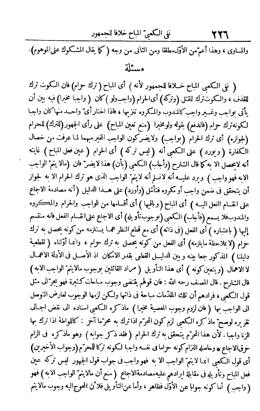 (نفي الكعبي الْمُبَاح خلافًا لِلْجُمْهُورِ لِأَنَّهُ) أَي الْمُبَاح (ترك حرَام) فَإِن السُّكُوت ترك للقذف، وَالسُّكُوت ترك للْقَتْل (وَتَركه) أَي الْحَرَام (وَاجِب وَلَو) كَانَ (وَاجِبا مُخَيّرا) فِيهِ بَين أَن يَأْتِي بِوَاجِب وَغير وَاجِب كالمندوب وَالْمَكْرُوه تَنْزِيها، فَإِذا اخْتَار أَي وَاحِد مِنْهَا كَانَ وَاجِبا لكَونه ترك حرَام (فَانْدفع) بقوله وَلَو مُخَيّرا (منع تعين الْمُبَاح) على رَأْي الْجُمْهُور (للترك) لِلْحَرَامِ (لجوازه) أَي ترك الْحَرَام (بِوَاجِب) وَلَا يضر كَون الْوَاجِب الْمُخَير مُبْهما لما عرفت من خِصَال الْكَفَّارَة (ويورد) على الكعبي أَنه (لَيْسَ تَركه) أَي الْحَرَام (عين فعل الْمُبَاح) غَايَته أَنه لَا يحصل إِلَّا بِهِ كَمَا قَالَ الشَّارِح (وَأجَاب) الكعبي (بِأَن) هَذَا لَا يضر فَإِن (مَا لَا يتم الْوَاجِب إِلَّا بِهِ فَهُوَ وَاجِب) وَيرد عَلَيْهِ أَنه لَا نسلم أَنه لَا يتم الْوَاجِب الَّذِي هُوَ ترك الْحَرَام إِلَّا بِهِ لجَوَاز أَن يتَحَقَّق فِي ضمن وَاجِب أَو مَكْرُوه فَتَأمل (وَأورد) على هَذَا الدَّلِيل (أَنه مصادمة الْإِجْمَاع على انقسام الْفِعْل إِلَيْهِ) أَي الْمُبَاح (وباقيها) أَي أقسامها من الْوَاجِب وَالْحرَام وَالْمَكْرُوه وَالْمَنْدُوب فَلَا يسمع (فَأجَاب) الكعبي (بِوُجُوب تَأْوِيله) أَي الْإِجْمَاع على انقسام الْفِعْل فَإِنَّهُ منقسم إِلَيْهَا (بِاعْتِبَارِهِ) أَي انفعل (فِي ذَاته) أَي مَعَ قطع النّظر عَمَّا يستلزمه من كَونه يحصل بِهِ ترك حرَام (لَا بملاحظة مَا يلْزمه) أَي الْفِعْل من كَونه يحصل بِهِ ترك حرَام، وَإِنَّمَا أوّلناه (لقطعية دليلنا) الْمَذْكُور جمعا بَينه وَبَين الدَّلِيل الْقطعِي بِقدر الْإِمْكَان إِذْ الأَصْل فِي الْأَدِلَّة الْأَعْمَال لَا الإهمال (وَيتَعَيَّن كَونه) أَي هَذَا التَّأْوِيل (مُرَاد الْقَائِلين بِوُجُوب مَا لَا يتم الْوَاجِب إِلَّا بِهِ) قَالَ الشَّارِح: قَالَ المُصَنّف رَحمَه الله: فَإِن قَوْلهم يَقْتَضِي وجوب مباحثات كَثِيرَة فَهُوَ يجر إِلَى مثل قَول الكعبي، فمرادهم أَن تِلْكَ الْمُقدمَات مُبَاحَة فِي ذَاتهَا وَلَكِن لَزِمَهَا الْوُجُوب لعَارض التَّوَصُّل إِلَى الْوَاجِب بهَا (فَإِن لُزُوم وجوب الْمعْصِيَة مُخَيّرا) مَا ذكره الكعبي إِسْنَاده إِلَى نقض إجمالي تَقْرِيره لَو صَحَّ مَا ذكره الكعبي لزم كَون الْمحرم إِذا ترك بِهِ محرما آخر: كاللواطة إِذا ترك بهَا الزِّنَا وَاجِبا. لِأَن هَذَا الْمحرم يتَحَقَّق بِهِ ترك الْحَرَام (فقد ذكر جَوَابه) وَهُوَ مَا ذكره فِي إِلْزَام حرق الْإِجْمَاع وَحَاصِله الْتِزَام كَونه حَرَامًا فِي نَفسه وَاجِبا لكَونه تركا للْمحرمِ (وَجَوَاب الْأَخيرينِ) أَي قَول الكعبي إِنَّمَا لَا يتم الْوَاجِب إِلَّا بِهِ فَهُوَ وَاجِب فِي جَوَاب قَول الْجُمْهُور لَيْسَ تَركه عين فعل الْمُبَاح وتأويله فِي مُقَابلَة إيرادهم عَلَيْهِ مصادمة الْإِجْمَاع (منع أَن مَا لَا يتم الْوَاجِب إِلَّا بِهِ) فَهُوَ (وَاجِب) أما كَونه جَوَابا عَن الأول فَظَاهر، وَأما عَن التَّأْوِيل فَلِأَن المحوج إِلَيْهِ وجوب مَا لَا يتم
