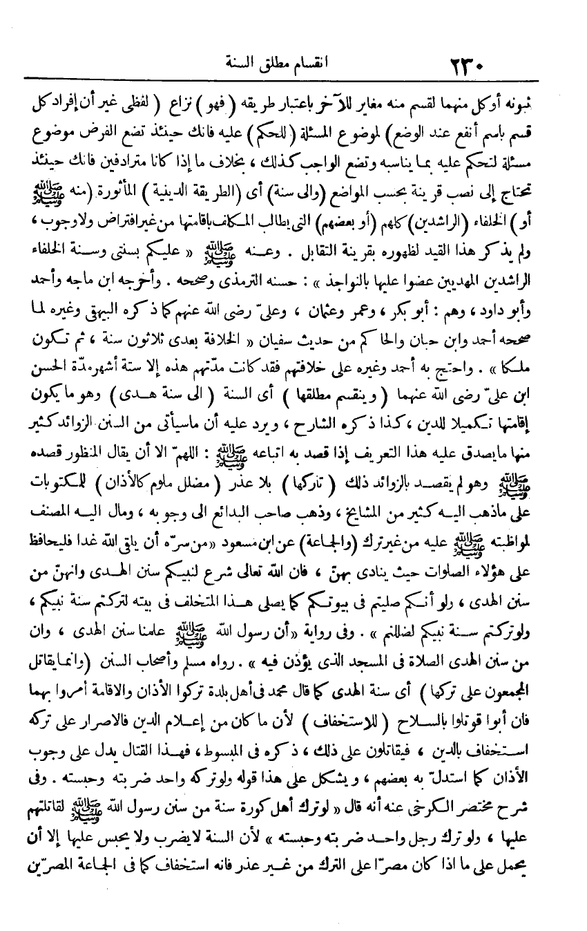 ثُبُوته أَو كل مِنْهُمَا لقسم مِنْهُ مُغَاير للْآخر بِاعْتِبَار طَريقَة (فَهُوَ) نزاع (لَفْظِي غير أَن إِفْرَاد كل قسم باسم أَنْفَع عِنْد الْوَضع) لموضوع المسئلة (للْحكم) عَلَيْهِ فَإنَّك حِينَئِذٍ تضع الْفَرْض مَوْضُوع مسئلة لتَحكم عَلَيْهِ بِمَا يُنَاسِبه وتضع الْوَاجِب كَذَلِك، بِخِلَاف مَا إِذا كَانَا مترادفين فَإنَّك حِينَئِذٍ تحْتَاج إِلَى نصب قرينَة بِحَسب الْمَوَاضِع (وَإِلَى سنة) أَي (الطَّرِيقَة الدِّينِيَّة) المأثورة (مِنْهُ صلى الله عَلَيْهِ وَسلم أَو) الْخُلَفَاء (الرَّاشِدين) كلهم (أَو بَعضهم) الَّتِي يُطَالب الْمُكَلف بإقامتها من غير افتراض وَلَا وجوب، وَلم يذكر هَذَا الْقَيْد لظُهُوره بِقَرِينَة التقابل. وَعنهُ صلى الله عَلَيْهِ وَسلم " عَلَيْكُم بِسنتي وَسنة الْخُلَفَاء الرَّاشِدين المهديين عضوا عَلَيْهَا بالنواجذ ": حسنه التِّرْمِذِيّ وَصَححهُ. وَأخرجه ابْن مَاجَه وَأحمد وَأَبُو دَاوُد، وهم: أَبُو بكر، وَعمر وَعُثْمَان، وَعلي رَضِي الله عَنْهُم كَمَا ذكره الْبَيْهَقِيّ وَغَيره لما صَححهُ أَحْمد وَابْن حبَان وَالْحَاكِم من حَدِيث سُفْيَان " الْخلَافَة بعدِي ثَلَاثُونَ سنة، ثمَّ تكون ملكا ". وَاحْتج بِهِ أَحْمد وَغَيره على خلافتهم فقد كَانَت مدتهم هَذِه إِلَّا سِتَّة أشهر مُدَّة الْحسن ابْن عَليّ رَضِي الله عَنْهُمَا (وينقسم مُطلقهَا) أَي السّنة (إِلَى سنة هدى) وَهُوَ مَا يكون إِقَامَتهَا تكميلا للدّين، كَذَا ذكره الشَّارِح، وَيرد عَلَيْهِ أَن مَا سَيَأْتِي من السّنَن الزَّوَائِد كثير مِنْهَا مَا يصدق عَلَيْهِ هَذَا التَّعْرِيف إِذا قصد بِهِ اتِّبَاعه صلى الله عَلَيْهِ وَسلم: اللَّهُمَّ إِلَّا أَن يُقَال المنظور قَصده صلى الله عَلَيْهِ وَسلم وَهُوَ لم يقْصد بالزوائد ذَلِك (تاركها) بِلَا عذر (مضلل ملوم كالأذان) للمكتوبات على مَا ذهب إِلَيْهِ كثير من الْمَشَايِخ، وَذهب صَاحب الْبَدَائِع إِلَى وُجُوبه، وَمَال إِلَيْهِ المُصَنّف لمواظبته صلى الله عَلَيْهِ وَسلم عَلَيْهِ من غير ترك (وَالْجَمَاعَة) عَن ابْن مَسْعُود " من سره أَن يلقى الله غَدا فليحافظ على هَؤُلَاءِ الصَّلَوَات حَيْثُ يُنَادي بِهن، فَإِن الله تَعَالَى شرع لنبيكم سنَن الْهدى وانهن من سنَن الْهدى، وَلَو أَنكُمْ صليتم فِي بُيُوتكُمْ كَمَا يُصَلِّي هَذَا المتخلف فِي بَيته لتركتم سنة نَبِيكُم، وَلَو تركْتُم سنة نَبِيكُم لَضَلَلْتُمْ ". وَفِي رِوَايَة " أَن رَسُول الله صلى الله عَلَيْهِ وَسلم علمنَا سنَن الْهدى، وَأَن من سنَن الْهدى الصَّلَاة فِي الْمَسْجِد الَّذِي يُؤذن فِيهِ ". رَوَاهُ مُسلم وَأَصْحَاب السّنَن (وَإِنَّمَا يُقَاتل المجمعون على تَركهَا) أَي سنة الْهدى كَمَا قَالَ مُحَمَّد فِي أهل بَلْدَة تركُوا الْأَذَان وَالْإِقَامَة أمروا بهما فَإِن أَبَوا قوتلوا بِالسِّلَاحِ (للاستخفاف) لِأَن مَا كَانَ من إِعْلَام الدّين فالإصرار على تَركه استخفاف بِالدّينِ، فيقاتلون على ذَلِك، ذكره فِي الْمَبْسُوط، فَهَذَا الْقِتَال يدل على وجوب الْأَذَان كَمَا اسْتدلَّ بِهِ بَعضهم، وَيشكل على هَذَا قَوْله وَلَو تَركه وَاحِد ضَربته وحبسته. وَفِي شرح مُخْتَصر الْكَرْخِي عَنهُ أَنه قَالَ " لَو ترك أهل كورة سنة من سنَن رَسُول الله صلى الله عَلَيْهِ وَسلم لقاتلتهم عَلَيْهَا، وَلَو ترك رجل وَاحِد ضَربته وحبسته " لِأَن السّنة لَا يضْرب وَلَا يحبس عَلَيْهَا إِلَّا أَن يحمل على مَا إِذا كَانَ مصرا على التّرْك من غير عذر فَإِنَّهُ استخفاف كَمَا فِي الْجَمَاعَة المصرين