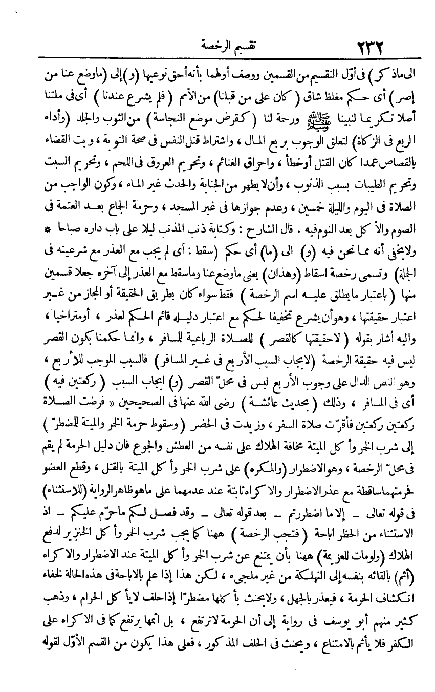 إِلَى مَا ذكر) فِي أول التَّقْسِيم من الْقسمَيْنِ وَوصف أَولهمَا بِأَنَّهُ أَحَق نوعيها (و) إِلَى (مَا وضع عَنَّا من إصر) أَي حكم مغلظ شاق (كَانَ على من قبلنَا) من الْأُمَم (فَلم يشرع عندنَا) أَي فِي ملتنا أصلا تكريما لنبينا صلى الله عَلَيْهِ وَسلم وَرَحْمَة لنا (كقرض مَوضِع النَّجَاسَة) من الثَّوْب وَالْجَلد (وَأَدَاء الرّبع فِي الزَّكَاة) لتَعلق الْوُجُوب بِربع المَال، وَاشْتِرَاط قتل النَّفس فِي صِحَة التَّوْبَة، وَبت الْقَضَاء بِالْقصاصِ عمدا كَانَ الْقَتْل أَو خطأ، وإحراق الْغَنَائِم، وَتَحْرِيم الْعُرُوق فِي اللَّحْم، وَتَحْرِيم السبت وَتَحْرِيم الطَّيِّبَات بِسَبَب الذُّنُوب، وَأَن لَا يطهر من الْجَنَابَة وَالْحَدَث غير المَاء، وَكَون الْوَاجِب من الصَّلَاة فِي الْيَوْم وَاللَّيْلَة خمسين، وَعدم جَوَازهَا فِي غير الْمَسْجِد، وَحُرْمَة الْجِمَاع بعد الْعَتَمَة فِي الصَّوْم وَالْأكل بعد النّوم فِيهِ. قَالَ الشَّارِح: وَكِتَابَة ذَنْب المذنب لَيْلًا على بَاب دَاره صباحا وَلَا يخفى أَنه مِمَّا نَحن فِيهِ (و) إِلَى (مَا) أَي حكم (سقط: أَي لم يجب مَعَ الْعذر مَعَ شرعيته فِي الْجُمْلَة) وَتسَمى رخصَة إِسْقَاط (وَهَذَانِ) يَعْنِي مَا وضع عَنَّا وَمَا سقط مَعَ الْعذر إِلَى آخِره جعلا قسمَيْنِ مِنْهَا (بِاعْتِبَار مَا يُطلق عَلَيْهِ اسْم الرُّخْصَة) فَقَط سَوَاء كَانَ بطرِيق الْحَقِيقَة أَو الْمجَاز من غير اعْتِبَار حَقِيقَتهَا، وَهُوَ أَن يشرع تَخْفِيفًا لحكم مَعَ اعْتِبَار دَلِيله قَائِم الحكم لعذر، أَو متراخيا، وَإِلَيْهِ أَشَارَ بقوله (لَا حَقِيقَتهَا كالقصر) للصَّلَاة الرّبَاعِيّة للْمُسَافِر، وَإِنَّمَا حكمنَا بِكَوْن الْقصر لَيْسَ فِيهِ حَقِيقَة الرُّخْصَة (لإِيجَاب السَّبَب الْأَرْبَع فِي غير الْمُسَافِر) فالسبب الْمُوجب للأربع، وَهُوَ النَّص الدَّال على وجوب الْأَرْبَع لَيْسَ فِي مَحل الْقصر (و) إِيجَاب السَّبَب (رَكْعَتَيْنِ فِيهِ) أَي فِي الْمُسَافِر، وَذَلِكَ (بِحَدِيث عَائِشَة) رَضِي الله عَنْهَا فِي الصَّحِيحَيْنِ " فرضت الصَّلَاة رَكْعَتَيْنِ رَكْعَتَيْنِ فأقرت صَلَاة السّفر وزيدت فِي الْحَضَر (وَسُقُوط حُرْمَة الْخمر وَالْميتَة للْمُضْطَر) إِلَى شرب الْخمر وَأكل الْميتَة مَخَافَة الْهَلَاك على نَفسه من الْعَطش والجوع فَإِن دَلِيل الْحُرْمَة لم يقم فِي مَحل الرُّخْصَة، وَهُوَ الِاضْطِرَار (وَالْمكْره) على شرب الْخمر وَأكل الْميتَة بِالْقَتْلِ، وَقطع الْعُضْو فحرمتهما سَاقِطَة مَعَ عذر الِاضْطِرَار وَالْإِكْرَاه ثَابِتَة عِنْد عدمهما على مَا هُوَ ظَاهر الرِّوَايَة (للاستثناء) فِي قَوْله تَعَالَى - {إِلَّا مَا اضطررتم} - بعد قَوْله تَعَالَى - {وَقد فصل لكم مَا حرم عَلَيْكُم} - إِذْ الِاسْتِثْنَاء من الْحَظْر إِبَاحَة (فَتجب الرُّخْصَة) هَهُنَا كَمَا يجب شرب الْخمر وَأكل الْخِنْزِير لدفع الْهَلَاك (وَلَو مَاتَ للعزيمة) هَهُنَا بِأَن يمْتَنع عَن شرب الْخمر وَأكل الْميتَة عِنْد الِاضْطِرَار وَالْإِكْرَاه (أَثم) بإلقائه بِنَفسِهِ إِلَى التَّهْلُكَة من غير ملجئ، لَكِن هَذَا إِذا علم بِالْإِبَاحَةِ فِي حق هَذِه الْحَالة لخفاء انكشاف الْحُرْمَة، فيعذر بِالْجَهْلِ، وَلَا يَحْنَث بأكلها مُضْطَرّا إِذا حلف لَا يَأْكُل الْحَرَام، وَذهب كثير مِنْهُم أَبُو يُوسُف فِي رِوَايَة إِلَى أَن الْحُرْمَة لَا ترْتَفع، بل إثمها يرْتَفع كَمَا فِي الْإِكْرَاه على الْكفْر فَلَا يَأْثَم بالامتناع، وَيحنث فِي الْحلف الْمَذْكُور، فعلى هَذَا يكون من الْقسم الأول لقَوْله