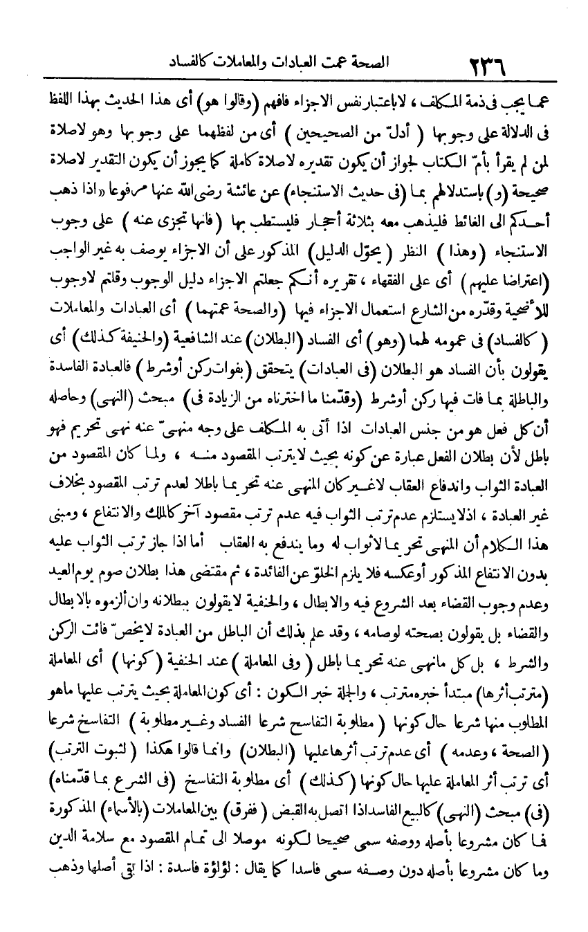 عَمَّا يجب فِي ذمَّة الْمُكَلف، لَا بِاعْتِبَار نفس الاجزاء فَافْهَم (وَقَالُوا هُوَ) أَي هَذَا الحَدِيث بِهَذَا اللَّفْظ فِي الدّلَالَة على وُجُوبهَا (أدل من الصَّحِيحَيْنِ) أَي من لَفْظهمَا على وُجُوبهَا وَهُوَ لَا صَلَاة لمن لم يقْرَأ بِأم الْكتاب لجَوَاز أَن يكون تَقْدِيره لَا صَلَاة كَامِلَة كَمَا يجوز أَن يكون التَّقْدِير لَا صَلَاة صَحِيحَة (و) باستدلالهم بِمَا (فِي حَدِيث الِاسْتِنْجَاء) عَن عَائِشَة رَضِي الله عَنْهَا مَرْفُوعا " إِذا ذهب أحدكُم إِلَى الْغَائِط فليذهب مَعَه بِثَلَاثَة أَحْجَار فليستطب بهَا (فَإِنَّهَا تجزى عَنهُ) على وجوب الِاسْتِنْجَاء (وَهَذَا) النّظر (يحول الدَّلِيل) الْمَذْكُور على أَن الاجزاء يُوصف بِهِ غير الْوَاجِب (اعتراضا عَلَيْهِم) أَي على الْفُقَهَاء، تَقْرِيره أَنكُمْ جعلتم الاجزاء دَلِيل الْوُجُوب وقلتم لَا وجوب للأضحية وَقدره من الشَّارِع اسْتِعْمَال الاجزاء فِيهَا (وَالصِّحَّة عمتهما) أَي الْعِبَادَات والمعاملات (كالفساد) فِي عُمُومه لَهما (وَهُوَ) أَي الْفساد (الْبطلَان) عِنْد الشَّافِعِيَّة (والحنيفة كَذَلِك) أَي يَقُولُونَ بِأَن الْفساد هُوَ الْبطلَان (فِي الْعِبَادَات) يتَحَقَّق (بِفَوَات ركن أَو شَرط) فالعبادة الْفَاسِدَة والباطلة بِمَا فَاتَ فِيهَا ركن أَو شَرط (وَقدمنَا مَا اخترناه من الزِّيَادَة فِي) مَبْحَث (النَّهْي) وَحَاصِله أَن كل فعل هُوَ من جنس الْعِبَادَات إِذا أَتَى بِهِ الْمُكَلف على وَجه مَنْهِيّ عَنهُ نهي تَحْرِيم فَهُوَ بَاطِل لِأَن بطلَان الْفِعْل عبارَة عَن كَونه بِحَيْثُ لَا يَتَرَتَّب الْمَقْصُود مِنْهُ، وَلما كَانَ الْمَقْصُود من الْعِبَادَة الثَّوَاب واندفاع الْعقَاب لَا غير كَانَ الْمنْهِي عَنهُ تَحْرِيمًا بَاطِلا لعدم ترَتّب الْمَقْصُود بِخِلَاف غير الْعِبَادَة، إِذْ لَا يسْتَلْزم عدم ترَتّب الثَّوَاب فِيهِ عدم ترَتّب مَقْصُود آخر كالملك وَالِانْتِفَاع، ومبني هَذَا الْكَلَام أَن الْمنْهِي تَحْرِيمًا لَا ثَوَاب لَهُ وَمَا ينْدَفع بِهِ الْعقَاب أما إِذا جَازَ ترَتّب الثَّوَاب عَلَيْهِ بِدُونِ الِانْتِفَاع الْمَذْكُور أَو عَكسه فَلَا يلْزم الْخُلُو عَن الْفَائِدَة، ثمَّ مُقْتَضى هَذَا بطلَان صَوْم يَوْم الْعِيد وَعدم وجوب الْقَضَاء بعد الشُّرُوع فِيهِ والإبطال، وَالْحَنَفِيَّة لَا يَقُولُونَ بِبُطْلَانِهِ وَإِن ألزموه بالإبطال وَالْقَضَاء بل يَقُولُونَ بِصِحَّتِهِ لَو صَامَهُ، وَقد علم بذلك أَن الْبَاطِل من الْعِبَادَة لَا يخص فَائت الرُّكْن وَالشّرط، بل كل مَا نهى عَنهُ تَحْرِيمًا بَاطِلا (وَفِي الْمُعَامَلَة) عِنْد الْحَنَفِيَّة (كَونهَا) أَي الْمُعَامَلَة (مترتب أَثَرهَا) مُبْتَدأ خَبره مترتب، وَالْجُمْلَة خبر الْكَوْن: أَي كَون الْمُعَامَلَة بِحَيْثُ يَتَرَتَّب عَلَيْهَا مَا هُوَ الْمَطْلُوب مِنْهَا شرعا حَال كَونهَا (مَطْلُوبَة التفاسح شرعا الْفساد وَغير مَطْلُوبه) التفاسخ شرعا (الصِّحَّة، وَعَدَمه) أَي عدم ترَتّب أَثَرهَا عَلَيْهَا (الْبطلَان) وَإِنَّمَا قَالُوا هَكَذَا (لثُبُوت الترتب) أَي ترَتّب أثر الْمُعَامَلَة عَلَيْهَا حَال كَونهَا (كَذَلِك) أَي مَطْلُوبَة التفاسخ (فِي الشَّرْع بِمَا قدمْنَاهُ) (فِي) مَبْحَث (النَّهْي) كَالْبيع الْفَاسِد إِذا اتَّصل بِهِ الْقَبْض (فَفرق) بَين الْمُعَامَلَات (بالأسماء) الْمَذْكُورَة فَمَا كَانَ مَشْرُوعا بِأَصْلِهِ وَوَصفه سمي صَحِيحا لكَونه موصلا إِلَى تَمام الْمَقْصُود مَعَ سَلامَة الدّين وَمَا كَانَ مَشْرُوعا بِأَصْلِهِ دون وَصفه سمي فَاسِدا كَمَا يُقَال: لؤلؤة فَاسِدَة: إِذا بَقِي أَصْلهَا وَذهب