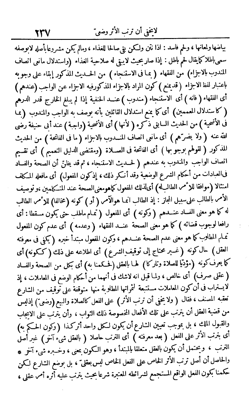 بياضها ولمعانها، وَلحم فَاسد: إِذا نَتن وَلَكِن بَقِي صَالحا للغذاء، وَمَا لم يكن مَشْرُوعا بِأَصْلِهِ لَا بوصفه سمى بَاطِلا كَمَا يُقَال لحم بَاطِل: إِذا صَار بِحَيْثُ لَا يبْقى لَهُ صَلَاحِية الْغذَاء (واستدلال مانعي اتصاف الْمَنْدُوب بالاجزاء) من الْفُقَهَاء (بِمَا فِي الِاسْتِنْجَاء) من الحَدِيث الْمَذْكُور إبْقَاء على وُجُوبه بِاعْتِبَار لفظ الاجزاء (قد يمْنَع) كَون المُرَاد بالاجزاء الْمَذْكُور فِيهِ الاجزاء عَن الْوَاجِب (عِنْدهم) أَي الْفُقَهَاء (فَإِنَّهُ) أَي الِاسْتِنْجَاء (مَنْدُوب) عِنْد الْحَنَفِيَّة إِذا لم يبلغ الْخَارِج قدر الدِّرْهَم (كاستدلال المعممين) أَي كَمَا يمْنَع اسْتِدْلَال الْقَائِلين بِأَنَّهُ يُوصف بِهِ الْوَاجِب وَالْمَنْدُوب (بِمَا فِي الْأُضْحِية) من الحَدِيث السَّابِق ذكره (لِأَنَّهَا) أَي الْأُضْحِية (وَاجِبَة) عِنْد أبي حنيفَة رَضِي الله عَنهُ (وَلَا يضرهم) أَي مانعي اتصاف الْمَنْدُوب بالاجزاء (مَا فِي الْفَاتِحَة) من الحَدِيث الْمَذْكُور (لقَولهم بِوُجُوبِهَا) أَي الْفَاتِحَة فِي الصَّلَاة (وَمُقْتَضى الدَّلِيل التَّعْمِيم) أَي تَقْسِيم اتصاف الْوَاجِب وَالْمَنْدُوب بِهِ عِنْدهم (لحَدِيث الِاسْتِنْجَاء، ثمَّ قد يظنّ أَن الصِّحَّة وَالْفساد فِي الْعِبَادَات من أَحْكَام الشَّرْع الوضعية وَقد أنكر ذَلِك، إِذْ كَون الْمَفْعُول) أَي مَا فعله الْمُكَلف امتثالا (مُوَافقا لِلْأَمْرِ الطَّالِب لَهُ) أَي لذَلِك الْمَفْعُول كَمَا هُوَ معنى الصِّحَّة عِنْد الْمُتَكَلِّمين، وتوصيف الْأَمر بالطالب على سَبِيل الْمجَاز: إِذْ الطَّالِب إِنَّمَا هُوَ الْآمِر (أَو) كَونه (مُخَالفا) لِلْأَمْرِ الطَّالِب لَهُ كَمَا هُوَ معنى الْفساد عِنْدهم (وَكَونه) أَي الْمَفْعُول (تَمام مَا طلب حَتَّى يكون مسْقطًا: أَي رَافعا لوُجُوب قَضَائِهِ) كَمَا هُوَ معنى الصِّحَّة عِنْد الْفُقَهَاء (وَعَدَمه) أَي عدم كَون الْمَفْعُول تَمام الْمَطْلُوب كَمَا هُوَ معنى عدم الصِّحَّة عِنْدهم، وَكَون الْمَفْعُول مُبْتَدأ خَبره (يَكْفِي فِي مَعْرفَته الْعقل) حَال كَونه (غير مُحْتَاج إِلَى تَوْقِيف الشَّرْع) أَي اطِّلَاعه على ذَلِك (كَكَوْنِهِ) أَي كَمَا يعرف كَونه (مُؤديا للصَّلَاة وتاركا) لَهَا بِالْعقلِ (فحكمنا بِهِ) أَي بِكُل من الصِّحَّة وَالْفساد (عَقْلِي صرف) أَي خَالص، وَلما قيل أَنه لَا شكّ فِي أَنَّهُمَا من أَحْكَام الْوَضع فِي الْمُعَامَلَات، إِذْ لَا يستراب فِي أَن كَون الْمُعَامَلَات مستتبعة لثمراتها الْمَطْلُوبَة مِنْهَا متوقفة على تَوْقِيف من الشَّارِع تعقبه المُصَنّف، فَقَالَ (وَلَا يخفى أَن ترَتّب الْأَثر) على الْفِعْل كَالصَّلَاةِ وَالْبيع (وضعي) إِذْ لَيْسَ من قَضِيَّة الْعقل أَن يَتَرَتَّب على تِلْكَ الْأَفْعَال الْمَخْصُوصَة ذَلِك الثَّوَاب، وَأَن يَتَرَتَّب على الْإِيجَاب وَالْقَبُول الْملك، بل بِمُوجب تعْيين الشَّارِع أَن يكون لكل وَاحِد أثر كَذَا (وَكَون الحكم بِهِ) أَي بترتب الْأَثر على الْفِعْل (بعد مَعْرفَته) أَي الترتب حَاصِلا (بِالْعقلِ شَيْء آخر) غير أصل الترتب، وَيحْتَمل أَن يكون بِالْعقلِ مُتَعَلقا بالمبتدأ، وَهُوَ الْكَوْن بِمَعْنى، وَخَبره شَيْء آخر وَالْحَاصِل أَن أصل ترَتّب الْأَثر الْخَاص على الْفِعْل الْخَاص لَيْسَ بعقلي، بل بِوَضْع الشَّارِع لَكِن حكمنَا بِكَوْن الْفِعْل الْوَاقِع المستجمع لشرائطه الْمُعْتَبرَة شرعا بِحَيْثُ يَتَرَتَّب عَلَيْهِ أَثَره أَمر عَقْلِي،