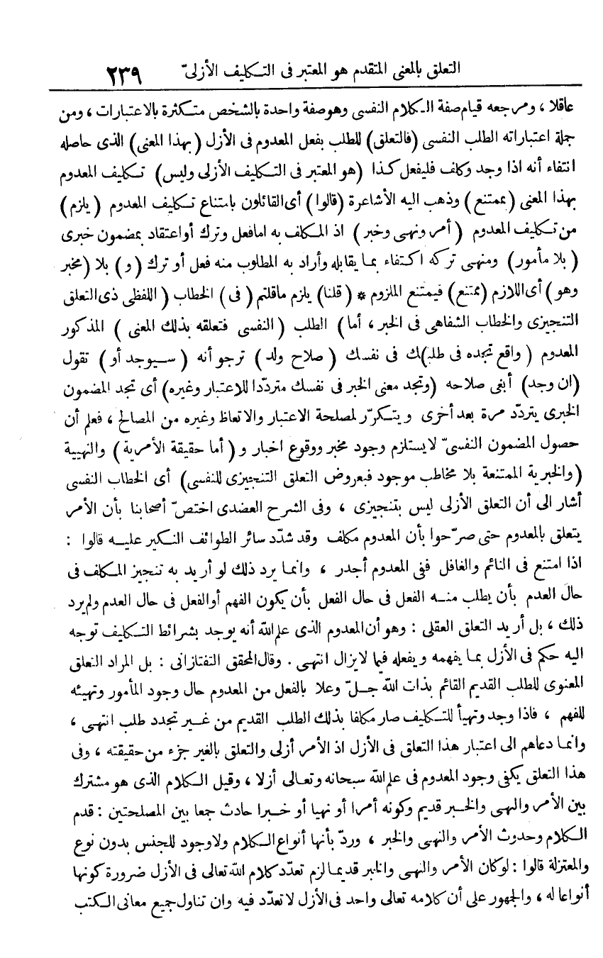 عَاقِلا. ومرجعه قيام صفة الْكَلَام النفسى وَهُوَ صفة وَاحِدَة بالشخص متكثرة بالاعتبارات، وَمن جملَة اعتباراته الطّلب النَّفْسِيّ (فالتعلق) للطلب بِفعل الْمَعْدُوم فِي الْأَزَل (بِهَذَا الْمَعْنى) الَّذِي حَاصله انْتِفَاء أَنه إِذا وجد وكلف فَلْيفْعَل كَذَا (هُوَ الْمُعْتَبر فِي التَّكْلِيف الأزلي وَلَيْسَ) تَكْلِيف الْمَعْدُوم بِهَذَا الْمَعْنى (مُمْتَنع) وَذهب إِلَيْهِ الأشاعرة (قَالُوا) أَي الْقَائِلُونَ بامتناع تَكْلِيف الْمَعْدُوم (يلْزم) من تَكْلِيف الْمَعْدُوم (أَمر وَنهي وَخبر) إِذْ الْمُكَلف بِهِ إِمَّا فعل وَترك أَو اعْتِقَاد بمضمون خبري (بِلَا مَأْمُور) ومنهي تَركه اكْتِفَاء بِمَا يُقَابله وَأَرَادَ بِهِ الْمَطْلُوب مِنْهُ فعل أَو ترك (و) بِلَا (مخبر وَهُوَ) أَي اللَّازِم (مُمْتَنع) فَيمْتَنع الْمَلْزُوم (قُلْنَا) يلْزم مَا قُلْتُمْ (فِي) الْخطاب (اللَّفْظِيّ ذِي التَّعَلُّق التنجيزي وَالْخطاب الشفاهي فِي الْخَبَر، أما) الطّلب (النَّفْسِيّ فتعلقه بذلك الْمَعْنى) الْمَذْكُور الْمَعْدُوم (وَاقع تَجدهُ فِي طلب) ك فِي نَفسك (صَلَاح ولد) ترجو أَنه (سيوجد أَو) تَقول (إِن وجد) أبغي صَلَاحه (وتجد معنى الْخَبَر فِي نَفسك مترددا للاعتبار وَغَيره) أَي تَجِد الْمَضْمُون الخبري يتَرَدَّد مرّة بعد أُخْرَى ويتكرر لمصْلحَة الِاعْتِبَار والاتعاظ وَغَيره من الْمصَالح، فَعلم أَن حُصُول الْمَضْمُون النَّفْسِيّ لَا يسْتَلْزم وجود مخبر وَوُقُوع أَخْبَار و (أما حَقِيقَة الأمرية) والنهيية (والخبرية الممتنعة بِلَا مُخَاطب مَوْجُود فبعروض التَّعَلُّق التنجيزي للنفسي) أَي الْخطاب النَّفْسِيّ أَشَارَ إِلَى أَن التَّعَلُّق الأزلي لَيْسَ بتنجيزي، وَفِي الشَّرْح العضدي اخْتصَّ أَصْحَابنَا بِأَن الْأَمر يتَعَلَّق بالمعدوم حَتَّى صَرَّحُوا بِأَن الْمَعْدُوم مُكَلّف وَقد شدد سَائِر الطوائف النكير عَلَيْهِ قَالُوا: إِذا امْتنع فِي النَّائِم والغافل فَفِي الْمَعْدُوم أَجْدَر، وَإِنَّمَا يرد ذَلِك لَو أُرِيد بِهِ تَنْجِيز الْمُكَلف فِي حَال الْعَدَم بِأَن يطْلب مِنْهُ الْفِعْل فِي حَال الْفِعْل بِأَن يكون الْفَهم أَو الْفِعْل فِي حَال الْعَدَم وَلم يرد ذَلِك، بل أُرِيد التَّعَلُّق الْعقلِيّ: وَهُوَ أَن الْمَعْدُوم الَّذِي علم الله أَنه يُوجد بشرائط التَّكْلِيف توجه إِلَيْهِ حكم فِي الْأَزَل بِمَا يفهمهُ ويفعله فِيمَا لَا يزَال انْتهى. وَقَالَ الْمُحَقق التَّفْتَازَانِيّ: بل المُرَاد التَّعَلُّق الْمَعْنَوِيّ للطلب الْقَدِيم الْقَائِم بِذَات الله جلّ وَعلا بِالْفِعْلِ من الْمَعْدُوم حَال وجود الْمَأْمُور وتهيئه للفهم، فَإِذا وجد وتهيأ للتكليف صَار مُكَلّفا بذلك الطّلب الْقَدِيم من غير تجدّد طلب انْتهى، وَإِنَّمَا دعاهم إِلَى اعْتِبَار هَذَا التَّعَلُّق فِي الْأَزَل إِذْ الْأَمر أزلي والتعلق بِالْغَيْر جُزْء من حَقِيقَته، وَفِي هَذَا التَّعَلُّق يكفى وجود الْمَعْدُوم فِي علم الله سُبْحَانَهُ وَتَعَالَى أزلا، وَقيل الْكَلَام الَّذِي هُوَ مُشْتَرك بَين الْأَمر وَالنَّهْي وَالْخَبَر قديم وَكَونه أمرا أَو نهيا أَو خَبرا حَادث جمعا بَين المصلحتين: قدم الْكَلَام وحدوث الْأَمر وَالنَّهْي وَالْخَبَر، ورد بِأَنَّهَا أَنْوَاع الْكَلَام وَلَا وجود للْجِنْس بِدُونِ نوع والمعتزلة قَالُوا: لَو كَانَ الْأَمر وَالنَّهْي وَالْخَبَر قَدِيما لزم تعدد كَلَام الله تَعَالَى فِي الْأَزَل ضَرُورَة كَونهَا أنواعا لَهُ، وَالْجُمْهُور على أَن كَلَامه تَعَالَى وَاحِد فِي الْأَزَل لَا تعدد فِيهِ وَإِن تنَاول جَمِيع مَعَاني الْكتب