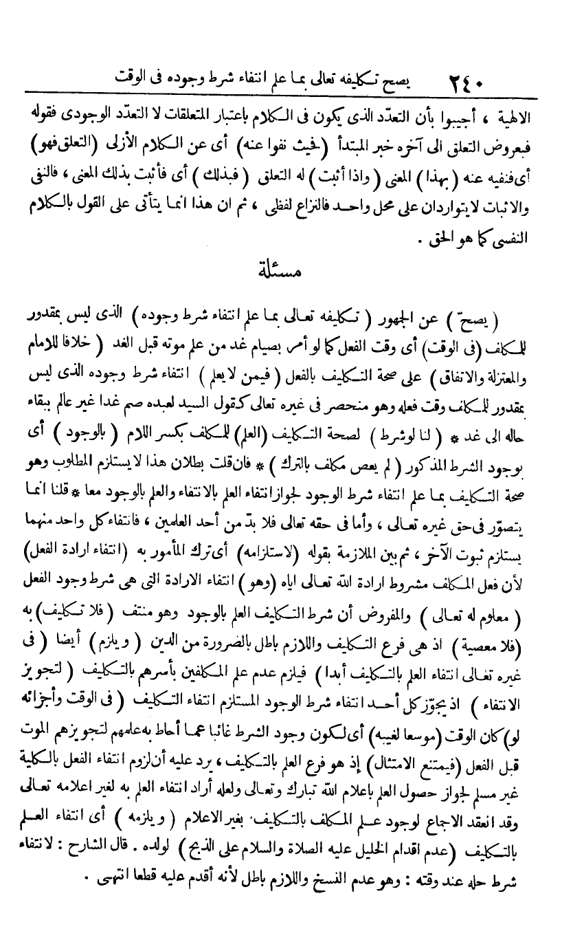 (يَصح) عَن الْجُمْهُور (تَكْلِيفه تَعَالَى بِمَا علم انْتِفَاء شَرط وجوده) الَّذِي لَيْسَ بمقدور للمكلف (فِي الْوَقْت) أَي وَقت الْفِعْل كَمَا لَو أَمر بصيام غَد من علم مَوته قبل الْغَد (خلافًا للْإِمَام والمعتزلة والاتفاق) على صِحَة التَّكْلِيف بِالْفِعْلِ (فِيمَن لَا يعلم) انْتِفَاء شَرط وجوده الَّذِي لَيْسَ بمقدور للمكلف وَقت فعله وَهُوَ منحصر فِي غَيره تَعَالَى كَقَوْل السَّيِّد لعَبْدِهِ صم غَدا غير عَالم بِبَقَاء حَاله إِلَى غَد (لنا لَو شَرط) لصِحَّة التَّكْلِيف (الْعلم) للمكلف بِكَسْر اللَّام (بالوجود) أَي بِوُجُود الشَّرْط الْمَذْكُور (لم يعْص مُكَلّف بِالتّرْكِ) فَإِن قلت بطلَان هَذَا لَا يسْتَلْزم الْمَطْلُوب وَهُوَ صِحَة التَّكْلِيف بِمَا علم انْتِفَاء شَرط الْوُجُود لجَوَاز انْتِفَاء الْعلم بالانتفاء وَالْعلم بالوجود مَعًا قُلْنَا إِنَّمَا يتَصَوَّر فِي حق غَيره تَعَالَى، وَأما فِي حَقه تَعَالَى فَلَا بُد من أحد العلمين، فانتفاء كل وَاحِد مِنْهُمَا يسْتَلْزم ثُبُوت الآخر، ثمَّ بَين الْمُلَازمَة بقوله (لاستلزامه) أَي ترك الْمَأْمُور بِهِ (انْتِفَاء إِرَادَة الْفِعْل) لِأَن فعل الْمُكَلف مَشْرُوط إِرَادَة الله تَعَالَى إِيَّاه (وَهُوَ) انْتِفَاء الْإِرَادَة الَّتِي هِيَ شَرط وجود الْفِعْل (مَعْلُوم لَهُ تَعَالَى) والمفروض أَن شَرط التَّكْلِيف الْعلم بالوجود وَهُوَ مُنْتَفٍ (فَلَا تَكْلِيف) بِهِ (فَلَا مَعْصِيّة) إِذْ هِيَ فرع التَّكْلِيف وَاللَّازِم بَاطِل بِالضَّرُورَةِ من الدّين (وَيلْزم) أَيْضا (فِي غَيره تَعَالَى انْتِفَاء الْعلم بالتكليف أبدا) فَيلْزم عدم علم الْمُكَلّفين بأسرهم بالتكليف (لتجويز الانتفاء) إِذْ يجوز كل أحد انْتِفَاء شَرط الْوُجُود المستلزم انْتِفَاء التَّكْلِيف (فِي الْوَقْت وأجزائه لَو) كَانَ الْوَقْت (موسعا لغيبه) أَي لكَون وجود الشَّرْط غَائِبا عَمَّا أحَاط بِهِ علمهمْ لتجويزهم الْمَوْت قبل الْفِعْل (فَيمْتَنع الِامْتِثَال) إِذْ هُوَ فرع الْعلم بالتكليف، يرد عَلَيْهِ أَن لُزُوم انْتِفَاء الْفِعْل بِالْكُلِّيَّةِ غير مُسلم لجَوَاز حُصُول الْعلم بإعلام الله تبَارك وَتَعَالَى وَلَعَلَّه أَرَادَ انْتِفَاء الْعلم بِهِ لغير إِعْلَامه تَعَالَى وَقد انْعَقَد الْإِجْمَاع لوُجُود علم الْمُكَلف بالتكليف بِغَيْر الْإِعْلَام (وَيلْزمهُ) أَي انْتِفَاء الْعلم بالتكليف (عدم إقدام الْخَلِيل عَلَيْهِ الصَّلَاة وَالسَّلَام على الذّبْح) لوَلَده. قَالَ الشَّارِح: لانْتِفَاء شَرط حلّه عِنْد وقته: وَهُوَ عدم النّسخ وَاللَّازِم بَاطِل لِأَنَّهُ أقدم عَلَيْهِ قطعا انْتهى.