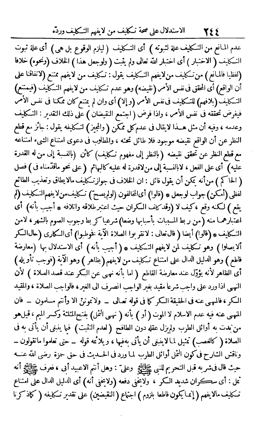 عدم الْمَانِع من التَّكْلِيف عِلّة لثُبُوته) أَي التَّكْلِيف (ليلزم الْوُقُوع بل هِيَ) أَي عِلّة ثُبُوت التَّكْلِيف (الاختبار) أَي اختبار الله تَعَالَى وَلم يثبت (وَلَو جعل هَذَا) الْخلاف (وَنَحْوه) خلافًا (لفظيا فالمانع) من تَكْلِيف من لَا يفهم التَّكْلِيف يَقُول: تَكْلِيف من لَا يفهم مُمْتَنع (لاتفاقنا على أَن الْوَاقِع) أَي الْمُحَقق فِي نفس الْأَمر (نقيضه) وَهُوَ عدم تَكْلِيف من لَا يفهم التَّكْلِيف (فَيمْتَنع) التَّكْلِيف (بِلَا فهم) للتكليف فِي نفس الْأَمر (وَإِلَّا) أَي وَإِن لم يمْتَنع كَانَ مُمكنا فِي نفس الْأَمر فيفرض تحَققه فِي نفس الْأَمر، وَإِذا فرض (اجْتمع النقيضان) عل ذَلِك التَّقْدِير: التَّكْلِيف وَعَدَمه، وَفِيه أَن مثل هَذَا لَا يُقَال فِي عدم كل مُمكن (والمجيز) لتكليفه يَقُول: جَائِز مَعَ قطع النّظر عَن أَن الْوَاقِع نقيضه مَوْجُود فَلَا طائل تَحْتَهُ، وَالْمَطْلُوب فِي دَعْوَى امْتنَاع الشَّيْء امْتِنَاعه مَعَ قطع النّظر عَن تحقق نقيضه (بِالنّظرِ إِلَى مَفْهُوم تَكْلِيف) كَائِن (بِالنِّسْبَةِ إِلَى من لَهُ الْقُدْرَة عَلَيْهِ) أَي على الْفِعْل، لَا بِالنِّسْبَةِ إِلَى من لَا قدرَة لَهُ عَلَيْهِ كَالْبَهَائِمِ (على نَحْو مَا قدمْنَاهُ فِي) فصل (الْحَاكِم) من أَنه يُمكن أَن يَقُول قَائِل: إِن الْخلاف فِي جَوَاز تَكْلِيف مَا لَا يُطَاق وتعذيب الطائع لَفْظِي (أمكن) جَوَاب لَو جعل (قَالُوا) أَي المخالفون (لَو لم يَصح) تَكْلِيف من لَا يفهم التَّكْلِيف (لم يَقع) لكنه وَقع، كَيفَ لَا (وَقد كلف السَّكْرَان حَيْثُ اعْتبر طَلَاقه وإتلافه أُجِيب بِأَنَّهُ) أَي اعتبارهما مِنْهُ (من ربط المسببات بأسبابها وضعا) شَرْعِيًّا كربط وجوب الصَّوْم بالشهر، لَا من التَّكْلِيف (قَالُوا) أَيْضا (قَالَ تَعَالَى: لَا تقربُوا الصَّلَاة الْآيَة فَخُوطِبُوا) أَي السكارى (حَال السكر أَلا يصلوا) وَهُوَ تَكْلِيف لمن لَا يفهم التَّكْلِيف (أُجِيب بِأَنَّهُ) أَي الِاسْتِدْلَال بهَا (مُعَارضَة قَاطع) وَهُوَ الدَّلِيل الدَّال على امْتنَاع تَكْلِيف من لَا يفهم (بِظَاهِر) وَهُوَ الْآيَة (فَوَجَبَ تَأْوِيله) أَي الظَّاهِر لِأَنَّهُ يؤول عِنْد مُعَارضَة الْقَاطِع (أما بِأَنَّهُ نهي عَن السكر عِنْد قصد الصَّلَاة) لِأَن النهى إِذا ورد على وَاجِب شرعا مُقَيّد بِغَيْر الْوَاجِب انْصَرف إِلَى الْغَيْر، فَالْوَاجِب الصَّلَاة، والمقيد السكر، فالمنهي عَنهُ فِي الْحَقِيقَة السكر كَمَا فِي قَوْله تَعَالَى - {وَلَا تموتن إِلَّا وَأَنْتُم مُسلمُونَ} - فَإِن الْمنْهِي عَنهُ فِيهِ عدم الْإِسْلَام إِلَّا الْمَوْت (أَو) بِأَنَّهُ (نهى الثمل) بِفَتْح الْمُثَلَّثَة وَكسر الْمِيم، قيل هُوَ من بَدَت بِهِ أَوَائِل الطَّرب وَلم يزل عقله دون الطافح (لعدم التثبت) فِيمَا يَنْبَغِي أَن يَأْتِي بِهِ فِي الصَّلَاة (كالغصب) تَمْثِيل لما لَا يَنْبَغِي أَن يَأْتِي بِهِ فِيهَا، ويلائمه قَوْله - {حَتَّى تعلمُوا مَا تَقولُونَ} - وناقش الشَّارِح فِي كَون الثمل أَوَائِل الطَّرب لما ورد فِي الحَدِيث فِي حق حَمْزَة رَضِي الله عَنهُ حَيْثُ قَالَ فِي شربه قبل التَّحْرِيم للنَّبِي صلى الله عَلَيْهِ وَسلم وعليّ: وَهل أَنْتُم إِلَّا عبيد أبي، فَعرف صلى الله عَلَيْهِ وَسلم أَنه ثمل: أَي سَكرَان شَدِيد السكر، وَلَا يخفى دَفعه (وَلَا يخفى أَنه) أَي الدَّلِيل الدَّال على امْتنَاع تَكْلِيف مَا لَا يفهم (إِنَّمَا يكون قَاطعا بِلُزُوم) اجْتِمَاع (النقيضين) على تَقْدِير تَكْلِيفه (كَمَا ذكرنَا