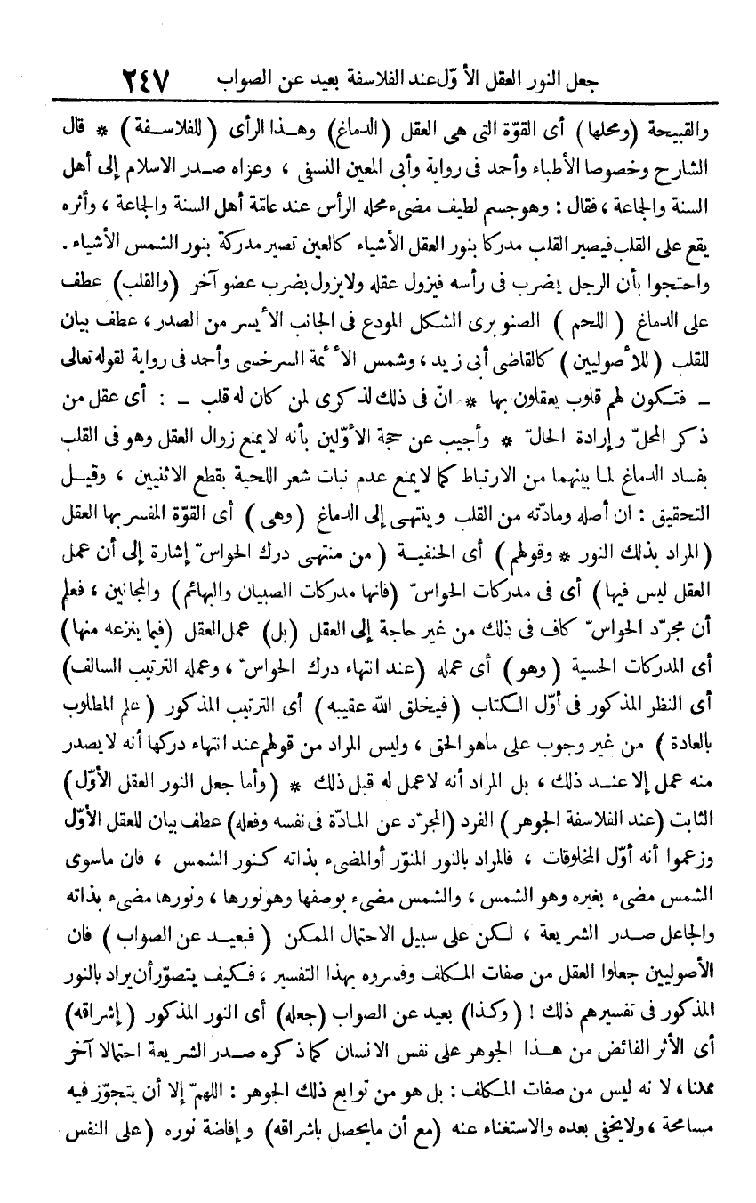 والقبيحة (ومحلها) أَي الْقُوَّة الَّتِي هِيَ الْعقل (الدِّمَاغ) وَهَذَا الرَّأْي (للفلاسفة) قَالَ الشَّارِح وخصوصا الْأَطِبَّاء وَأحمد فِي رِوَايَة وَأبي الْمعِين النَّسَفِيّ، وَعَزاهُ صدر الْإِسْلَام إِلَى أهل السّنة وَالْجَمَاعَة، فَقَالَ: وَهُوَ جسم لطيف مضيء مَحَله الرَّأْس عِنْد عَامَّة أهل السّنة وَالْجَمَاعَة، وأثره يَقع على الْقلب فَيصير الْقلب مدْركا بِنور الْعقل الْأَشْيَاء كَالْعَيْنِ تصير مدركة بِنور الشَّمْس الْأَشْيَاء. وَاحْتَجُّوا بِأَن الرجل يضْرب فِي رَأسه فيزول عقله وَلَا يَزُول بِضَرْب عُضْو آخر (وَالْقلب) عطف على الدِّمَاغ (اللَّحْم) الصنوبري الشكل الْمُودع فِي الْجَانِب الْأَيْسَر من الصَّدْر، عطف بَيَان للقلب (للأصوليين) كَالْقَاضِي أبي زيد، وشمس الْأَئِمَّة السَّرخسِيّ وَأحمد فِي رِوَايَة لقَوْله تَعَالَى - {فَتكون لَهُم قُلُوب يعْقلُونَ بهَا} {إِن فِي ذَلِك لذكرى لمن كَانَ لَهُ قلب} -: أَي عقل من ذكر الْمحل وَإِرَادَة الْحَال وَأجِيب عَن حجَّة الْأَوَّلين بِأَنَّهُ لَا يمْنَع زَوَال الْعقل وَهُوَ فِي الْقلب بِفساد الدِّمَاغ لما بَينهمَا من الارتباط كَمَا لَا يمْنَع عدم نَبَات شعر اللِّحْيَة بِقطع الاثنيين، وَقيل التَّحْقِيق: أَن أَصله ومادته من الْقلب وَيَنْتَهِي إِلَى الدِّمَاغ (وَهِي) أَي الْقُوَّة الْمُفَسّر بهَا الْعقل (المُرَاد بذلك النُّور وَقَوْلهمْ) أَي الْحَنَفِيَّة (من مُنْتَهى دَرك الْحَواس إِشَارَة إِلَى أَن عمل الْعقل لَيْسَ فِيهَا) أَي فِي مدركات الْحَواس (فَإِنَّهَا مدركات الصّبيان والبهائم) والمجانين، فَعلم أَن مُجَرّد الْحَواس كَاف فِي ذَلِك من غير حَاجَة إِلَى الْعقل (بل) عمل الْعقل (فِيمَا يَنْزعهُ مِنْهَا) أَي المدركات الحسية (وَهُوَ) أَي عمله (عِنْد انْتِهَاء دَرك الْحَواس، وَعَمله التَّرْتِيب السالف) أَي النّظر الْمَذْكُور فِي أول الْكتاب (فيخلق الله عَقِيبه) أَي التَّرْتِيب الْمَذْكُور (علم الْمَطْلُوب بِالْعَادَةِ) من غير وجوب على مَا هُوَ الْحق، وَلَيْسَ المُرَاد من قَوْلهم عِنْد انْتِهَاء دركها أَنه لَا يصدر مِنْهُ عمل إِلَّا عِنْد ذَلِك، بل المُرَاد أَنه لَا عمل لَهُ قبل ذَلِك (وَأما جعل النُّور الْعقل الأول) الثَّابِت (عِنْد الفلاسفة الْجَوْهَر) الْفَرد (الْمُجَرّد عَن الْمَادَّة فِي نَفسه وَفعله) عطف بَيَان لِلْعَقْلِ الأول وَزَعَمُوا أَنه أول الْمَخْلُوقَات، فَالْمُرَاد بِالنورِ الْمنور أَو المضيء بِذَاتِهِ كنور الشَّمْس، فَإِن مَا سوى الشَّمْس مضيء بِغَيْرِهِ وَهُوَ الشَّمْس، وَالشَّمْس مضيء بوصفها وَهُوَ نورها، ونورها مضيء بِذَاتِهِ والجاعل صدر الشَّرِيعَة، لَكِن على سَبِيل الِاحْتِمَال الْمُمكن (فبعيد عَن الصَّوَاب) فَإِن الْأُصُولِيِّينَ جعلُوا الْعقل من صِفَات الْمُكَلف وفسروه بِهَذَا التَّفْسِير، فَكيف يتَصَوَّر أَن يُرَاد بِالنورِ الْمَذْكُور فِي تفسيرهم ذَلِك! (وَكَذَا) بعيد عَن الصَّوَاب (جعله) أَي النُّور الْمَذْكُور (إشراقه) أَي الْأَثر الفائض من هَذَا الْجَوْهَر على نفس الْإِنْسَان كَمَا ذكره صدر الشَّرِيعَة احْتِمَالا آخر مُمكنا، لِأَنَّهُ لَيْسَ من صِفَات الْمُكَلف: بل هُوَ من تَوَابِع ذَلِك الْجَوْهَر: اللَّهُمَّ إِلَّا أَن يتجوز فِيهِ مُسَامَحَة، وَلَا يخفى بعده والاستغناء عَنهُ (مَعَ أَن مَا يحصل بإشراقه) وإفاضة نوره (على النَّفس