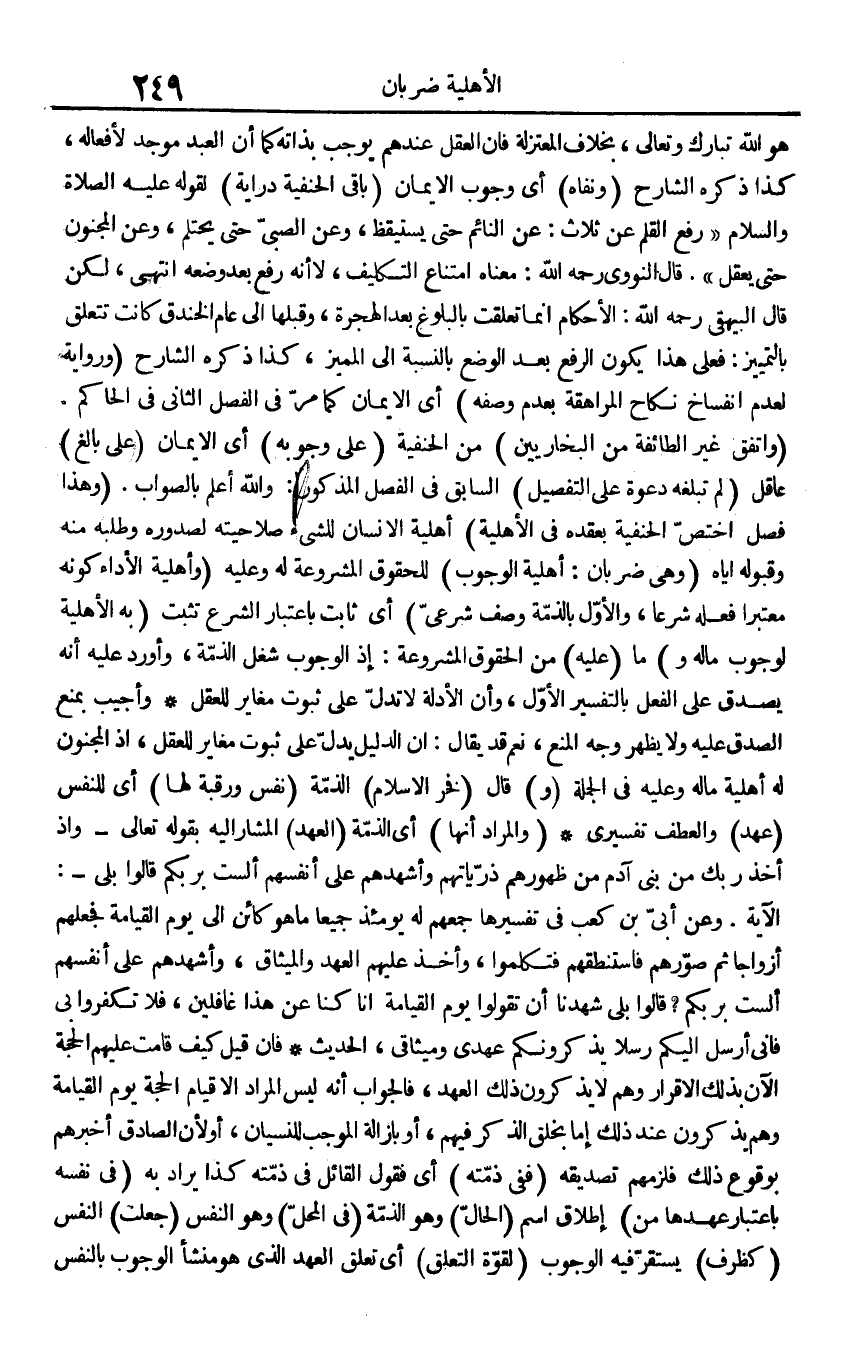 هُوَ الله تبَارك وَتَعَالَى، بِخِلَاف الْمُعْتَزلَة فَإِن الْعقل عِنْدهم يُوجب بِذَاتِهِ كَمَا أَن العَبْد موجد لأفعاله. كَذَا ذكره الشَّارِح (ونفاه) أَي وجوب الْإِيمَان (بَاقِي الْحَنَفِيَّة دارية) لقَوْله صلى الله عَلَيْهِ وَسلم " رفع الْقَلَم عَن ثَلَاث: عَن النَّائِم حَتَّى يَسْتَيْقِظ، وَعَن الصبيّ حَتَّى يَحْتَلِم، وَعَن الْمَجْنُون حَتَّى يعقل ". قَالَ النَّوَوِيّ رَحمَه الله: مَعْنَاهُ امْتنَاع التَّكْلِيف، لَا أَنه رفع بعد وَضعه انْتهى، لَكِن قَالَ الْبَيْهَقِيّ رَحمَه الله: الْأَحْكَام إِنَّمَا تعلّقت بِالْبُلُوغِ بعد الْهِجْرَة، وَقبلهَا إِلَى عَام الخَنْدَق كَانَت تتَعَلَّق بالتمييز: فعلى هَذَا يكون الرّفْع بعد الْوَضع بِالنِّسْبَةِ إِلَى الْمُمَيز، كَذَا ذكره الشَّارِح (وَرِوَايَة لعدم انْفِسَاخ نِكَاح المراهقة بِعَدَمِ وَصفه) أَي الْإِيمَان كَمَا مر فِي الْفَصْل الثَّانِي فِي الْحَاكِم. (وَاتفقَ غير الطَّائِفَة من البخاريين) من الْحَنَفِيَّة (على وُجُوبه) أَي الْإِيمَان (على بَالغ) عَاقل (لم تبلغه دَعْوَة على التَّفْصِيل) السَّابِق فِي الْفَصْل الْمَذْكُور: وَالله أعلم بِالصَّوَابِ. (وَهَذَا فصل اخْتصَّ الْحَنَفِيَّة بعقده فِي الْأَهْلِيَّة) أَهْلِيَّة الْإِنْسَان للشَّيْء صلاحيته لصدوره وَطَلَبه مِنْهُ وقبوله إِيَّاه (وَهِي ضَرْبَان: أَهْلِيَّة الْوُجُوب) للحقوق الْمَشْرُوعَة لَهُ وَعَلِيهِ (وأهلية الْأَدَاء كَونه مُعْتَبرا فعله شرعا، وَالْأول بِالذِّمةِ وصف شَرْعِي) أَي ثَابت بِاعْتِبَار الشَّرْع تثبت (بِهِ الْأَهْلِيَّة لوُجُوب مَاله و) مَا (عَلَيْهِ) من الْحُقُوق الْمَشْرُوعَة: إِذْ الْوُجُوب شغل الذِّمَّة، وَأورد عَلَيْهِ أَنه يصدق على الْفِعْل بالتفسير الأول، وَأَن الْأَدِلَّة لَا تدل على ثُبُوت مُغَاير لِلْعَقْلِ وَأجِيب بِمَنْع الصدْق عَلَيْهِ وَلَا يظْهر وَجه الْمَنْع، نعم قد يُقَال: إِن الدَّلِيل يدل على ثُبُوت مُغَاير لِلْعَقْلِ، إِذْ الْمَجْنُون لَهُ أَهْلِيَّة مَاله وَعَلِيهِ فِي الْجُمْلَة (و) قَالَ (فَخر الْإِسْلَام) الذِّمَّة (نفس ورقبة لَهَا) أَي للنَّفس (عهد) والعطف تفسيري (وَالْمرَاد أَنَّهَا) أَي الذِّمَّة (الْعَهْد) الْمشَار إِلَيْهِ بقوله تَعَالَى - {وَإِذا أَخذ رَبك من بني آدم من ظُهُورهمْ ذرياتهم وأشهدهم على أنفسهم أَلَسْت بربكم قَالُوا بلَى} -: الْآيَة. وَعَن أبيّ بن كَعْب فِي تَفْسِيرهَا جمعهم لَهُ يَوْمئِذٍ جَمِيعًا مَا هُوَ كَائِن إِلَى يَوْم الْقِيَامَة فجعلهم أَزْوَاجًا ثمَّ صورهم فاستنطقهم فتكلموا، وَأخذ عَلَيْهِم الْعَهْد والميثاق، وأشهدهم على أنفسهم أَلَسْت بربكم؟ قَالُوا بلَى شَهِدنَا أَن تَقولُوا يَوْم الْقِيَامَة أَنا كُنَّا عَن هَذَا غافلين، فَلَا تكفرُوا بِي فَإِنِّي أرسل إِلَيْكُم رسلًا يذكرونكم عهدي وميثاقي، والْحَدِيث فَإِن قيل كَيفَ قَامَت عَلَيْهِم الْحجَّة الْآن بذلك الْإِقْرَار وهم لَا يذكرُونَ ذَلِك الْعَهْد، فَالْجَوَاب أَنه لَيْسَ المُرَاد إِلَّا قيام الْحجَّة يَوْم الْقِيَامَة وهم يذكرُونَ عِنْد ذَلِك إِمَّا بِخلق الذّكر فيهم، أَو بِإِزَالَة الْمُوجب للنسيان، أَو لِأَن الصَّادِق أخْبرهُم بِوُقُوع ذَلِك فلزمهم تَصْدِيقه (فَفِي ذمَّته) أَي فَقَوْل الْقَائِل فِي ذمَّته كَذَا يُرَاد بِهِ (فِي نَفسه بِاعْتِبَار عهدهما من) إِطْلَاق اسْم (الحالّ) وَهُوَ الذمّة (فِي الْمحل) وَهُوَ النَّفس (جعلت) النَّفس (كظرف) يسْتَقرّ فِيهِ الْوُجُوب (لقُوَّة التَّعَلُّق) أَي تعلق الْعَهْد الَّذِي هُوَ منشأ الْوُجُوب بِالنَّفسِ