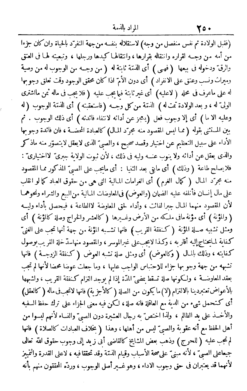 (فَقبل الْولادَة ثمَّ نفس مُنْفَصِل من وَجه) لاستقلاله بِنَفسِهِ من جِهَة التفرد بِالْحَيَاةِ وَإِن كَانَ جُزْءا من أمه من وَجه لقراره وانتقاله بقرارها، وانتقالها كيدها ورجلها، وتبعيته لَهَا فِي الْعتْق وَالرّق ودخوله فِي بيعهَا (فَهِيَ) أَي الذِّمَّة ثَابِتَة لَهُ (من وَجه من الْوُجُوب لَهُ من وَصِيَّة وميراث وَنسب وَعتق على الِانْفِرَاد) أَي دون الْأُم إِذا كَانَ مُحَقّق الْوُجُود وَقت تعلق وُجُوبهَا لَهُ على مَا عرف فِي مَحَله (لَا عَلَيْهِ) أَي غير ثَابِتَة فِيمَا يجب عَلَيْهِ (فَلَا يجب فِي مَاله ثمن مَا اشْترى الْوَلِيّ لَهُ، وَبعد الْولادَة تمت لَهُ) الذِّمَّة من كل وَجه (فاستعقبته) أَي الذِّمَّة الْوُجُوب (لَهُ وَعَلِيهِ إِلَّا مَا) أَي إِلَّا وجوب فعل (يعجز عَن أَدَائِهِ لانْتِفَاء فَائِدَته) أَي ذَلِك الْوُجُوب. ثمَّ بَين الْمُسْتَثْنى بقوله (مِمَّا لَيْسَ الْمَقْصُود مِنْهُ مُجَرّد المَال) كالعبادة الْمَحْضَة، فَإِن فَائِدَة وُجُوبهَا الْأَدَاء على سَبِيل التَّعْظِيم عَن اخْتِيَار وَقصد صَحِيح، وَالصَّبِيّ الَّذِي لَا يعقل لَا يتَصَوَّر مِنْهُ مَا ذكر وَالَّذِي يعقل عَن أَدَائِهِ وَلَا يَنُوب عَنهُ وليه فِي ذَلِك، لِأَن ثُبُوت الْولَايَة جبري لَا اختياريّ: فَلَا يصلح طَاعَة (وَذَلِكَ) أَي مَا بَقِي بعد الثنيا: أَي مَا يجب على الصَّبِي الْمَذْكُور مِمَّا الْمَقْصُود مِنْهُ مُجَرّد المَال (كَمَال الْغرم) أَي الغرامات الْمَالِيَّة الَّتِي هِيَ من حُقُوق الْعباد كَمَا لَو انْقَلب على مَال إِنْسَان فأتلفه عَلَيْهِ الضَّمَان (والعوض) فِي الْمُعَاوَضَات الْمَالِيَّة من البيع وَالشِّرَاء وَنَحْوهمَا لِأَن الْمَقْصُود مِنْهُمَا المَال جبرا لفائت، وَأَدَاء لحق الْمُعَارضَة لَا الطَّاعَة، فَيحصل بأَدَاء وليه (والمؤنة) أَي مُؤنَة مَا فِي ملكه من الأَرْض وَغَيرهَا (كالعشر وَالْخَرَاج وصلَة كالمؤنة) أَي وَمثل تَشْبِيه صلَة الْمُؤْنَة (كَنَفَقَة الْقَرِيب) فَإِنَّهَا تشبه الْمُؤْنَة من جِهَة أَنَّهَا تجب على الْغَنِيّ كِفَايَة لما يحْتَاج إِلَيْهِ أَقَاربه، وَكَذَا لَا يجب على غير الْمُوسر، وَالْمَقْصُود مِنْهَا سد خلة الْقَرِيب بوصول كِفَايَته، وَذَلِكَ بِالْمَالِ (وكالعوض) أَي وَمثل صلَة تشبه الْعِوَض (كَنَفَقَة الزَّوْجَة) فَإِنَّهَا تشبهه من جِهَة وُجُوبهَا جُزْء للاحتباس الْوَاجِب عَلَيْهَا، وَمَا جعلت عوضا مَحْضا لِأَنَّهُمَا لم تجب بِعقد الْمُعَاوضَة، ولكونها صلَة تسْقط بمضيّ الْمدَّة إِذا لم يُوجد الْتِزَام كَنَفَقَة الْقَرِيب، ولشبهما بالأعواض تعْتَبر دينا بالالتزام (لَا) مَا يكون من الصِّلَة (كالأجزية) فَإِنَّهَا لَا تجب فِي مَاله (كالعقل) أَي كتحمل شَيْء من الدِّيَة مَعَ الْعَاقِلَة فَإِنَّهُ صلَة، لَكِن فِيهِ معنى الْجَزَاء على ترك حفظ السَّفِيه وَالْأَخْذ على يَد الظَّالِم، وَلذَا اخْتصَّ بِهِ رجال الْعَشِيرَة دون الصَّبِي وَالنِّسَاء لأَنهم لَيْسُوا من أهل الْحِفْظ مَعَ أَنه عُقُوبَة وَالصَّبِيّ لَيْسَ من أَهلهَا، وَهَذَا (بِخِلَاف الْعِبَادَات كَالصَّلَاةِ) فَإِنَّهَا لم تجب عَلَيْهِ (للْحَرج) وَذهب بعض الْمَشَايِخ كَالْقَاضِي أبي زيد إِلَى وجوب حُقُوق الله تَعَالَى جَمِيعًا على الصَّبِي، لِأَنَّهُ مَبْنِيّ على صِحَة الْأَسْبَاب وَقيام الذِّمَّة وَقد تحققا فِيهِ، لَا على الْقُدْرَة والتمييز لِأَنَّهُمَا قد يعتبران فِي حق وجوب الْأَدَاء، وَهُوَ غير أصل الْوُجُوب، ورده الْمُحَقِّقُونَ مِنْهُم بِأَنَّهُ