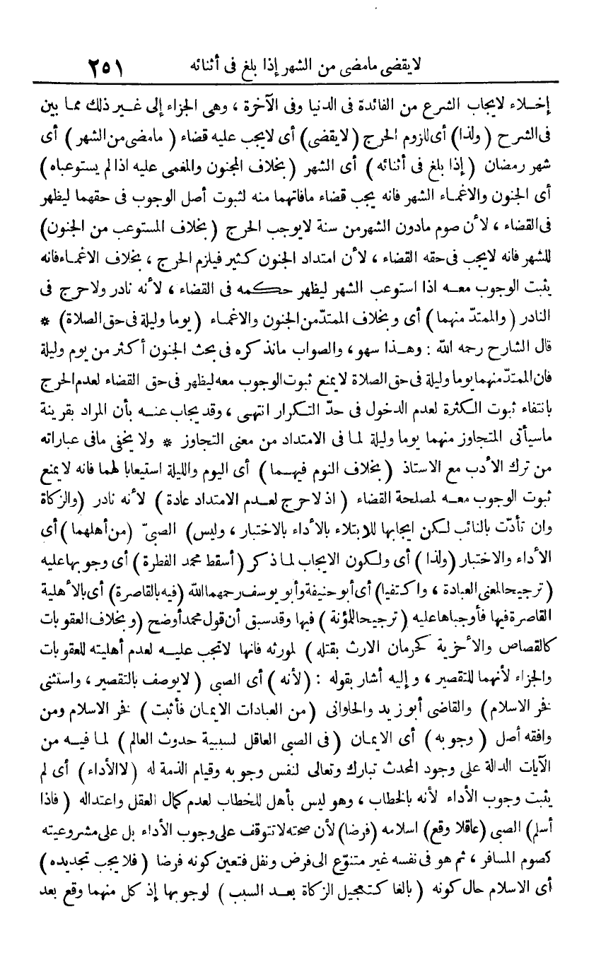 إخلاء لَا يُجَاب الشَّرْع من الْفَائِدَة فِي الدُّنْيَا وَفِي الْآخِرَة، وَهِي الْجَزَاء إِلَى غير ذَلِك مِمَّا بَين فِي الشَّرْح (وَلذَا) أَي للُزُوم الْحَرج (لَا يقْضِي) أَي لَا يجب عَلَيْهِ قَضَاء (مَا مضى من الشَّهْر) أَي شهر رَمَضَان (إِذا بلغ فِي أَثْنَائِهِ) أَي الشَّهْر (بِخِلَاف الْمَجْنُون والمغمى عَلَيْهِ إِذا لم يستوعباه) أَي الْجُنُون وَالْإِغْمَاء الشَّهْر فَإِنَّهُ يجب قَضَاء مَا فاتهما مِنْهُ لثُبُوت أصل الْوُجُوب فِي حَقّهمَا ليظْهر فِي الْقَضَاء، لِأَن صَوْم مَا دون الشَّهْر من سنة لَا يُوجب الْحَرج (بِخِلَاف الْمُسْتَوْعب من الْجُنُون) للشهر فَإِنَّهُ لَا يجب فِي حَقه الْقَضَاء، لِأَن امتداد الْجُنُون كثير فَيلْزم الْحَرج، بِخِلَاف الْإِغْمَاء فَإِنَّهُ يثبت الْوُجُوب مَعَه إِذا استوعب الشَّهْر ليظْهر حكمه فِي الْقَضَاء، لِأَنَّهُ نَادِر وَلَا حرج فِي النَّادِر (والممتد مِنْهُمَا) أَي وَبِخِلَاف الممتد من الْجُنُون وَالْإِغْمَاء (يَوْمًا وَلَيْلَة فِي حق الصَّلَاة) قَالَ الشَّارِح رَحمَه الله: وَهَذَا سَهْو، وَالصَّوَاب مَا نذكرهُ فِي بحث الْجُنُون أَكثر من يَوْم وَلَيْلَة فَإِن الممتد مِنْهُمَا يَوْمًا وَلَيْلَة فِي حق الصَّلَاة لَا يمْنَع ثُبُوت الْوُجُوب مَعَه ليظْهر فِي حق الْقَضَاء لعدم الْحَرج بِانْتِفَاء ثُبُوت الْكَثْرَة لعدم الدُّخُول فِي حد التّكْرَار انْتهى، وَقد يُجَاب عَنهُ بِأَن المُرَاد بِقَرِينَة مَا سَيَأْتِي المتجاوز مِنْهُمَا يَوْمًا وَلَيْلَة لما فِي الامتداد من معنى التجاوز وَلَا يخفى مَا فِي عباراته من ترك الْأَدَب مَعَ الْأُسْتَاذ (بِخِلَاف النّوم فيهمَا) أَي الْيَوْم وَاللَّيْلَة استيعابا لَهما فَإِنَّهُ لَا يمْنَع ثُبُوت الْوُجُوب مَعَه لمصْلحَة الْقَضَاء (إِذْ لَا حرج لعدم الامتداد عَادَة) لِأَنَّهُ نَادِر (وَالزَّكَاة وَإِن تأدت بالنائب لَكِن إِيجَابهَا للابتلاء بِالْأَدَاءِ بِالِاخْتِيَارِ، وَلَيْسَ) الصَّبِي (من أهلهما) أَي الْأَدَاء وَالِاخْتِيَار (وَلذَا) أَي وَلكَون الْإِيجَاب لما ذكر (أسقط مُحَمَّد الْفطْرَة) أَي وُجُوبهَا عَلَيْهِ (تَرْجِيحا لِمَعْنى الْعِبَادَة، واكتفيا) أَي أَبُو حنيفَة وَأَبُو يُوسُف رحمهمَا الله (فِيهِ بالقاصرة) أَي بالأهلية القاصرة فِيهَا فأوجباها عَلَيْهِ (تَرْجِيحا للمؤنة) فِيهَا وَقد سبق أَن قَول مُحَمَّد أوضح (وَبِخِلَاف الْعُقُوبَات كَالْقصاصِ والأجزية كحرمان الْإِرْث بقتْله) لمورثه فَإِنَّهَا لَا تجب عَلَيْهِ لعدم أَهْلِيَّته للعقوبات وَالْجَزَاء لِأَنَّهُمَا للتقصير، وَإِلَيْهِ أَشَارَ بقوله: (لِأَنَّهُ) أَي الصَّبِي (لَا يُوصف بالتقصير، وَاسْتثنى فَخر الْإِسْلَام) وَالْقَاضِي أَبُو زيد والحلواني (من الْعِبَادَات الْإِيمَان فَأثْبت) فَخر الْإِسْلَام وَمن وَافقه أصل (وُجُوبه) أَي الْإِيمَان (فِي الصَّبِي الْعَاقِل لسببية حُدُوث الْعَالم) لما فِيهِ من الْآيَات الدَّالَّة على وجود الْمُحدث تبَارك وَتَعَالَى لنَفس وُجُوبه وَقيام الذِّمَّة لَهُ (لَا الْأَدَاء) أَي لم يثبت وجوب الْأَدَاء لِأَنَّهُ بِالْخِطَابِ، وَهُوَ لَيْسَ بِأَهْل للخطاب لعدم كَمَال الْعقل واعتداله (فَإِذا أسلم) الصَّبِي (عَاقِلا وَقع) إِسْلَامه (فرضا) لِأَن صِحَّته لَا تتَوَقَّف على وجوب الْأَدَاء بل على مشروعيته كَصَوْم الْمُسَافِر، ثمَّ هُوَ فِي نَفسه غير متنوع إِلَى فرض وَنفل فَتعين كَونه فرضا (فَلَا يجب تجديده) أَي الْإِسْلَام حَال كَونه (بَالغا كتعجيل الزَّكَاة بعد السَّبَب) لوُجُوبهَا إِذْ كل مِنْهُمَا وَقع بعد