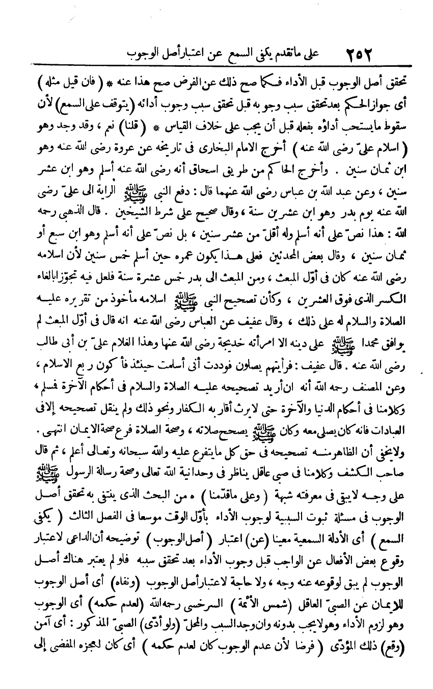 تحقق أصل الْوُجُوب قبل الْأَدَاء فَكَمَا صَحَّ ذَلِك عَن الْفَرْض صَحَّ هَذَا عَنهُ (فَإِن قيل مثله) أَي جَوَاز الحكم بعد تحقق سَبَب وُجُوبه قبل تحقق سَبَب وجوب أَدَائِهِ (يتَوَقَّف على السّمع) لِأَن سُقُوط مَا يسْتَحبّ أَدَاؤُهُ بِفِعْلِهِ قبل أَن يجب على خلاف الْقيَاس (قُلْنَا) نعم، وَقد وجد وَهُوَ (إِسْلَام عليّ رَضِي الله عَنهُ) أخرج الإِمَام البُخَارِيّ فِي تَارِيخه عَن عُرْوَة رَضِي الله عَنهُ وَهُوَ ابْن ثَمَان سِنِين. وَأخرج الْحَاكِم من طَرِيق إِسْحَاق أَنه رَضِي الله عَنهُ أسلم وَهُوَ ابْن عشر سِنِين، وَعَن عبد الله بن عَبَّاس رَضِي الله عَنْهُمَا قَالَ: دفع النَّبِي صلى الله عَلَيْهِ وَسلم الرَّايَة إِلَى عليّ رَضِي الله عَنهُ يَوْم بدر وَهُوَ ابْن عشْرين سنة، وَقَالَ صَحِيح على شَرط الشَّيْخَيْنِ. قَالَ الذَّهَبِيّ رَحمَه الله: هَذَا نَص على أَنه أسلم وَله أقل من عشر سِنِين، بل نَص على أَنه أسلم وَهُوَ ابْن سبع أَو ثَمَان سِنِين، وَقَالَ بعض الْمُحدثين فعلى هَذَا يكون عمره حِين أسلم خمس سِنِين لِأَن إِسْلَامه رَضِي الله عَنهُ كَانَ فِي أول المبعث، وَمن المبعث إِلَى بدر خمس عشرَة سنة فَلَعَلَّ فِيهِ تجوزا بإلغاء الْكسر الَّذِي فَوق الْعشْرين، وَكَأن تَصْحِيح النَّبِي صلى الله عَلَيْهِ وَسلم إِسْلَامه مَأْخُوذ من تَقْرِيره عَلَيْهِ الصَّلَاة وَالسَّلَام لَهُ على ذَلِك، وَقَالَ عفيف عَن الْعَبَّاس رَضِي الله عَنهُ أَنه قَالَ فِي أول المبعث لم يُوَافق مُحَمَّدًا عَلَيْهِ الصَّلَاة وَالسَّلَام على دينه إِلَّا امْرَأَته خَدِيجَة رَضِي الله عَنْهَا وَهَذَا الْغُلَام عليّ بن أبي طَالب رَضِي الله عَنهُ. قَالَ عفيف: فرأيتهم يصلونَ فوددت أَنِّي أسلمت حِينَئِذٍ فَأَكُون ربع الْإِسْلَام، وَعَن المُصَنّف رَحمَه الله أَنه إِن أُرِيد تَصْحِيحه صلى الله عَلَيْهِ وَسلم فِي أَحْكَام الْآخِرَة فَمُسلم، وكلامنا فِي أَحْكَام الدُّنْيَا وَالْآخِرَة حَتَّى لَا يَرث أَقَاربه الْكفَّار وَنَحْو ذَلِك وَلم ينْقل تَصْحِيحه إِلَّا فِي الْعِبَادَات فَإِنَّهُ كَانَ يُصَلِّي مَعَه وَكَانَ صلى الله عَلَيْهِ وَسلم يصحح صلَاته، وَصِحَّة الصَّلَاة فرع صِحَة الْإِيمَان انْتهى. وَلَا يخفى أَن الظَّاهِر مِنْهُ تَصْحِيحه فِي حق كل مَا يترفع عَلَيْهِ وَالله سُبْحَانَهُ وَتَعَالَى أعلم، ثمَّ قَالَ صَاحب الْكَشْف وكلامنا فِي صبي عَاقل يناظر فِي وحدانية الله تَعَالَى وَصِحَّة رِسَالَة الرَّسُول صلى الله عَلَيْهِ وَسلم على وَجه لَا يبْقى فِي مَعْرفَته شُبْهَة (وعَلى مَا قدمنَا) هـ من الْبَحْث الَّذِي ينتفى بِهِ تحقق أصل الْوُجُوب فِي مسئلة ثُبُوت السَّبَبِيَّة لوُجُوب الْأَدَاء بِأول الْوَقْت موسعا فِي الْفَصْل الثَّالِث (يَكْفِي السّمع) أَي الْأَدِلَّة السمعية معينا (عَن) اعْتِبَار (أصل الْوُجُوب) تَوْضِيحه أَن الدَّاعِي لاعْتِبَار وُقُوع بعض الْأَفْعَال عَن الْوَاجِب قبل وجوب الْأَدَاء بعد تحقق سَببه فَلَو لم يعْتَبر هُنَاكَ أصل الْوُجُوب لم يبْق لوُقُوعه عَنهُ وَجه، وَلَا حَاجَة لاعْتِبَار أصل الْوُجُوب (ونفاه) أَي أصل الْوُجُوب للْإيمَان عَن الصَّبِي الْعَاقِل (شمس الْأَئِمَّة) السَّرخسِيّ رَحمَه الله (لعدم حكمه) أَي الْوُجُوب وَهُوَ لُزُوم الْأَدَاء وَهُوَ لَا يجب بِدُونِهِ وَإِن وجد السَّبَب وَالْمحل (وَلَو أدّى) الصبيّ الْمَذْكُور أَي آمن (وَقع) ذَلِك المؤدّي (فرضا لِأَن عدم الْوُجُوب كَانَ لعدم حكمه) أَي كَانَ لعَجزه المفضي إِلَيّ