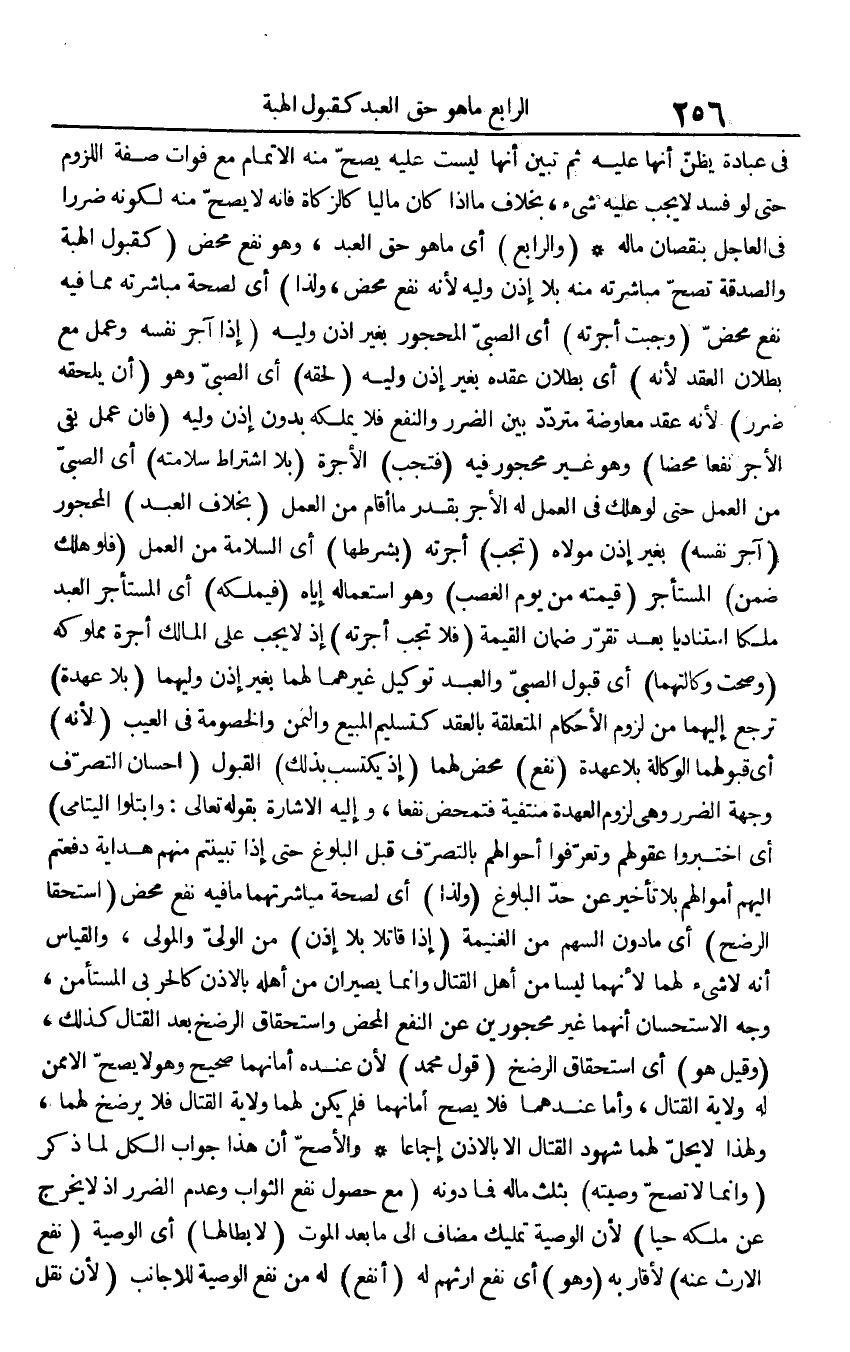 فِي عبَادَة يظنّ أَنَّهَا عَلَيْهِ ثمَّ تبين أَنَّهَا لَيست عَلَيْهِ يَصح مِنْهُ الْإِتْمَام مَعَ فَوَات صفة اللُّزُوم حَتَّى لَو فسد لَا يجب عَلَيْهِ شَيْء، بِخِلَاف مَا إِذا كَانَ ماليا كَالزَّكَاةِ فَإِنَّهُ لَا يصحّ مِنْهُ لكَونه ضَرَرا فِي العاجل بِنُقْصَان مَاله (وَالرَّابِع) أَي مَا هُوَ حق العَبْد، وَهُوَ نفع مَحْض (كقبول الْهِبَة وَالصَّدَََقَة تصح مُبَاشَرَته مِنْهُ بِلَا إِذن وليه لِأَنَّهُ نفع مَحْض، وَلذَا) أَي لصِحَّة مُبَاشَرَته مِمَّا فِيهِ نفع مَحْض (وَجَبت أجرته) أَي الصَّبِي الْمَحْجُور بِغَيْر إِذن وليه (إِذا آجر نَفسه وَعمل مَعَ بطلَان العقد لِأَنَّهُ) أَي بطلَان عقده بِغَيْر إِذن وليه (لحقه) أَي الصَّبِي وَهُوَ (أَن يلْحقهُ ضَرَر) لِأَنَّهُ عقد مُعَاوضَة مُتَرَدّد بَين الضَّرَر والنفع فَلَا يملكهُ بِدُونِ إِذن وليه (فَإِن عمل بَقِي الْأجر نفعا مَحْضا) وَهُوَ غير مَحْجُور فِيهِ (فَتجب) الْأُجْرَة (بِلَا اشْتِرَاط سَلَامَته) أَي الصَّبِي من الْعَمَل حَتَّى لَو هلك فِي الْعَمَل لَهُ الْأجر بِقدر مَا أَقَامَ من الْعَمَل (بِخِلَاف العَبْد) الْمَحْجُور (آجر نَفسه) بِغَيْر إِذن مَوْلَاهُ (تجب) أجرته (بشرطها) أَي السَّلامَة من الْعَمَل (فَلَو هلك ضمن) الْمُسْتَأْجر (قِيمَته من يَوْم الْغَصْب) وَهُوَ اسْتِعْمَاله إِيَّاه (فَيملكهُ) أَي الْمُسْتَأْجر العَبْد ملكا استناديا بعد تقرر ضَمَان الْقيمَة (فَلَا تجب أجرته) إِذْ لَا يجب على الْمَالِك أُجْرَة مَمْلُوكه (وَصحت وكالتهما) أَي قبُول الصَّبِي وَالْعَبْد تَوْكِيل غَيرهمَا لَهما بِغَيْر إِذن وليهما (بِلَا عُهْدَة) ترجع إِلَيْهِمَا من لُزُوم الْأَحْكَام الْمُتَعَلّقَة بِالْعقدِ كتسليم الْمَبِيع وَالثمن وَالْخُصُومَة فِي الْعَيْب (لِأَنَّهُ) أَي قبولهما الْوكَالَة بِلَا عُهْدَة (نفع) مَحْض لَهما (إِذْ يكْتَسب بذلك) الْقبُول (إِحْسَان التَّصَرُّف وجهة الضَّرَر وَهِي لُزُوم الْعهْدَة منتفية فتمحض نفعا، وَإِلَيْهِ الْإِشَارَة بقوله تَعَالَى: {وابتلوا الْيَتَامَى} أَي اختبروا عُقُولهمْ وتعرفوا أَحْوَالهم بِالتَّصَرُّفِ قبل الْبلُوغ حَتَّى إِذا تبينتم مِنْهُم هِدَايَة دفعتم إِلَيْهِم أَمْوَالهم بِلَا تَأْخِير عَن حد الْبلُوغ (وَلذَا) أَي لصِحَّة مباشرتهما مَا فِيهِ نفع مَحْض (استحقا الرضخ) أَي مَا دون السهْم من الْغَنِيمَة (إِذا قَاتلا بِلَا إِذن) من الْوَلِيّ وَالْمولى، وَالْقِيَاس أَنه لَا شَيْء لَهما لِأَنَّهُمَا ليسَا من أهل الْقِتَال وَإِنَّمَا يصيران من أَهله بِالْإِذْنِ كالحربي الْمُسْتَأْمن، وَجه الِاسْتِحْسَان أَنَّهُمَا غير محجورين عَن النَّفْع الْمَحْض وَاسْتِحْقَاق الرضخ بعد الْقِتَال كَذَلِك، (وَقيل هُوَ) أَي اسْتِحْقَاق الرضخ (قَول مُحَمَّد) لِأَن عِنْده أمانهما صَحِيح وَهُوَ لَا يَصح إِلَّا مِمَّن لَهُ ولَايَة الْقِتَال، وَأما عِنْدهمَا فَلَا يَصح أمانهما فَلم يكن لَهما ولَايَة الْقِتَال فَلَا يرْضخ لَهما، وَلِهَذَا لَا يحل لَهما شُهُود الْقِتَال إِلَّا بِالْإِذْنِ إِجْمَاعًا وَالأَصَح أَن هَذَا جَوَاب الْكل لما ذكر (وَإِنَّمَا لَا تصح وَصيته) بِثلث مَاله فَمَا دونه (مَعَ حُصُول نفع الثَّوَاب وَعدم الضَّرَر إِذْ لَا يخرج عَن ملكه حَيا) لِأَن الْوَصِيَّة تمْلِيك مُضَاف إِلَى مَا بعد الْمَوْت (لإبطالها) أَي الْوَصِيَّة (نفع الْإِرْث عَنهُ) لأقاربه (وَهُوَ) أَي نفع إرثهم لَهُ (أَنْفَع) لَهُ من نفع الْوَصِيَّة للأجانب (لِأَن نقل