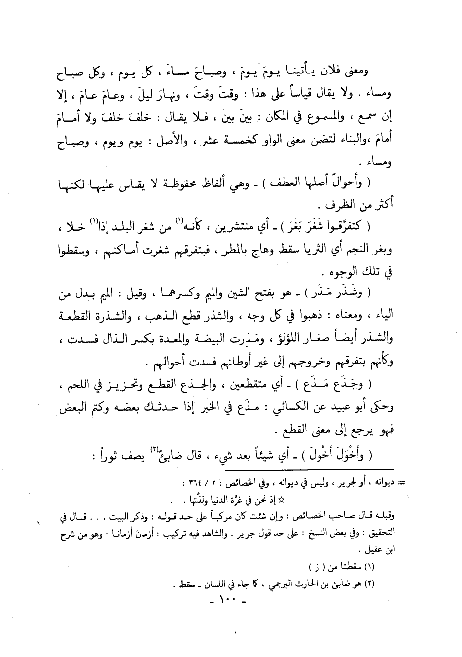 ومعنى فلان يأتينا يومَ يومَ، وصباح مساء، كل يوم، وكل صباح ومساء. ولا يقال قياساً على هذا: وقتَ وقتَ، ونهار ليل، وعام عام، إلا إن سمع، والمسموع في المكان: بين بين، فلا يقال: خلفَ خلفَ ولا أمامَ أمامَ، والبناء لتضمن معنى الواو كخمسة عشر، والأصل: يوم ويوم، وصباح ومساء.