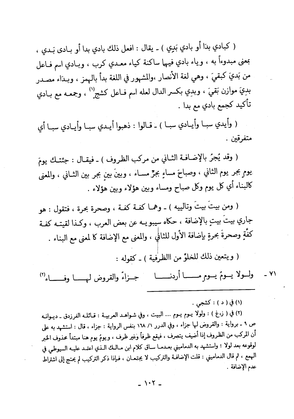 (وقد يُجرُ بالإضافة الثاني من مركب الظروف) - فيقال: جئتك يوم يوم بجر يوم الثاني، وصباح مساء بجر مساء، وبين بين بجر بين الثاني، والمعنى كالبناء أي كل يوم وكل صباح ومساء وبني هؤلاء وبين هؤلاء.