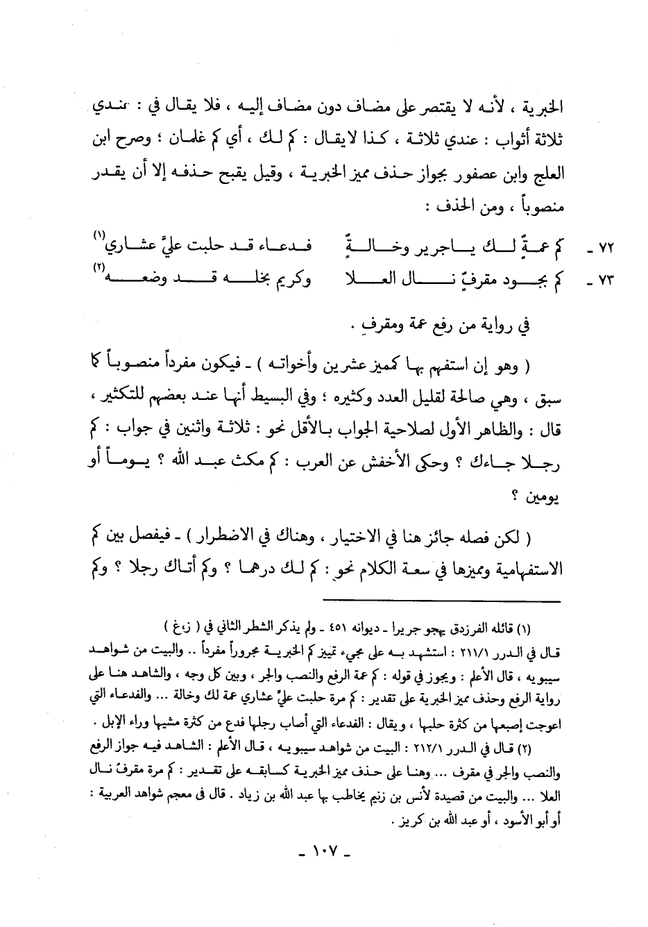 الخبرية، لأنه لا يقتصر على مضاف دون مضاف إليه، فلا يقال في: عندي ثلاثة أثواب: عندي ثلاثة، كذا لا يقال: كم لك، أي كم غلمان؛ وصرح ابن العلج وابن عصفور بجواز حذف مميز الخبرية، وقيل يقبح حذفه إلا أن يقدر منصوباً، ومن الحذف: