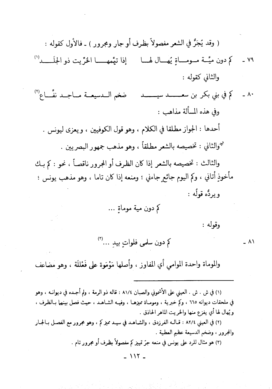 والثالث: تخصيصه بالشعر إذا كان الظرف أو المجرور ناقصاً، نحو: كم بك مأخوذٍ أتاني، وكم اليوم جائع جاءني؛ ومنعه إذا كان تاماً، وهو مذهب يونس؛