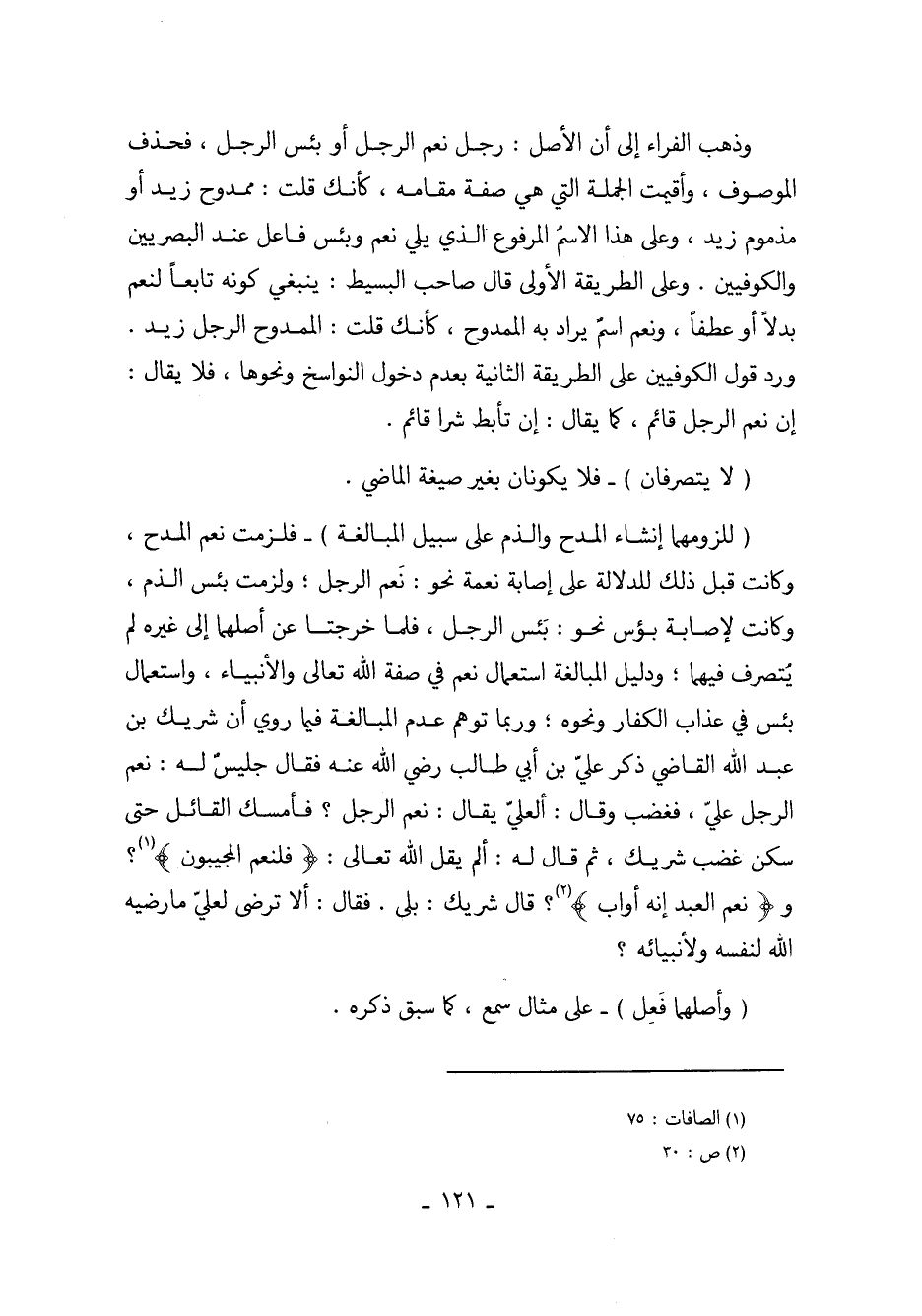 (للزومهما إنشاء المدح والذم على سبيل المبالغة) - فلزمت نعم المدح، وكانت قبل ذلك للدلالة على إصابة نعمة نحو: نعم الرجل؛ ولزمت بئس الذم، وكانت لإصابة بؤس نحو: بئس الرجل، فلما خرجتا عن أصلهما إلى غيره لم يُتصرف فيهما؛ ودليل المبالغة استعمال نعم في صفة الله تعالى والأنبياء، واستعمال بئس في عذاب الكفار ونحوه؛ وربما توهم عدم المبالغة فيما روي أن شريك بن عبد الله القاضي ذكر علي بن أبي طالب رضي الله عنه فقال جليس له: نعم الرجل علي، فغضب وقال: ألعليّ يقال: نعم الرجل؟ فأمسك القائل حتى سكن غضب شريك، ثم قال له: ألم يقل الله تعالى: (فلنعم المجيبون)؟ و (نعم العبد إنه أواب)؟ قال شريك: بلى. فقال: ألا ترضى لعليّ ما رضيه الله لنفسه ولأنبيائه؟