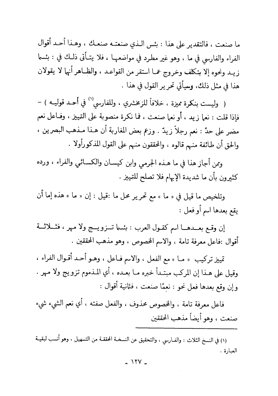 (وليست بنكرة مميزة، خلافاً للزمخشري، وللفارسي في أحد قوليه) - فإذا قلت: نعما زيد، أو نعما صنعت، فما نكرة منصوبة على التمييز، وفاعل نعم مضمر على حد: نعم رجلاً زيدٌ. وزعم بعض المغاربة أن هذا مذهب البصريين، والحق أن طائفة منهم قالوه، والمحققون منهم على القول المذكور أولا.