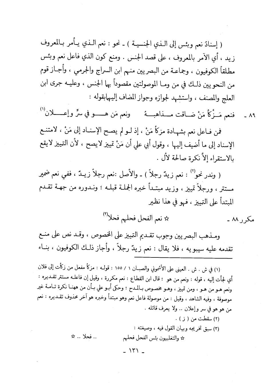 (إسنادُ نعم وبئس إلى الذي الجنسية) - نحو: نعم الذي يأمر بالمعروف زيد، أي الآمر بالمعروف، على قصد الجنس. ومنع كون الذي فاعل نعم وبئس مطلقاً الكوفيون، وجماعة من البصريين منهم ابن السراج والجرمي، وأجاز وم من النحويين ذلك في من وما الموصولتين مقصوداً بهما الجنس، وعليه جرى ابن العلج والمصنف، واستشهد لجوازه وجواز المضاف إليهما بقوله: