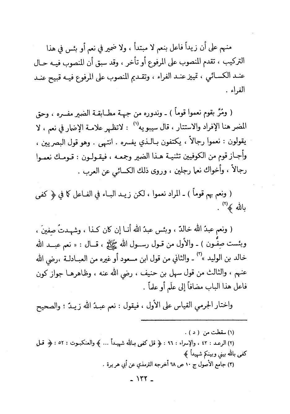 (ونعم عبدُ الله خالدٌ، وبئس عبدُ الله أنا إن كان كذا، وشهدتُ صفين، وبئست صِفُّون) - والأول من قول رسول الله صلى الله عليه وسلم، قال: "نعم عبد الله خالد بن الوليد" - والثاني من قول ابن مسعود أو غيره من العبادلة، رضي الله عنهم، والثالث من قول سهل بن حنيف، رضي الله عنه، وظاهرها جواز كون فاعل هذا الباب مضافاً إلى علم أو علماً.