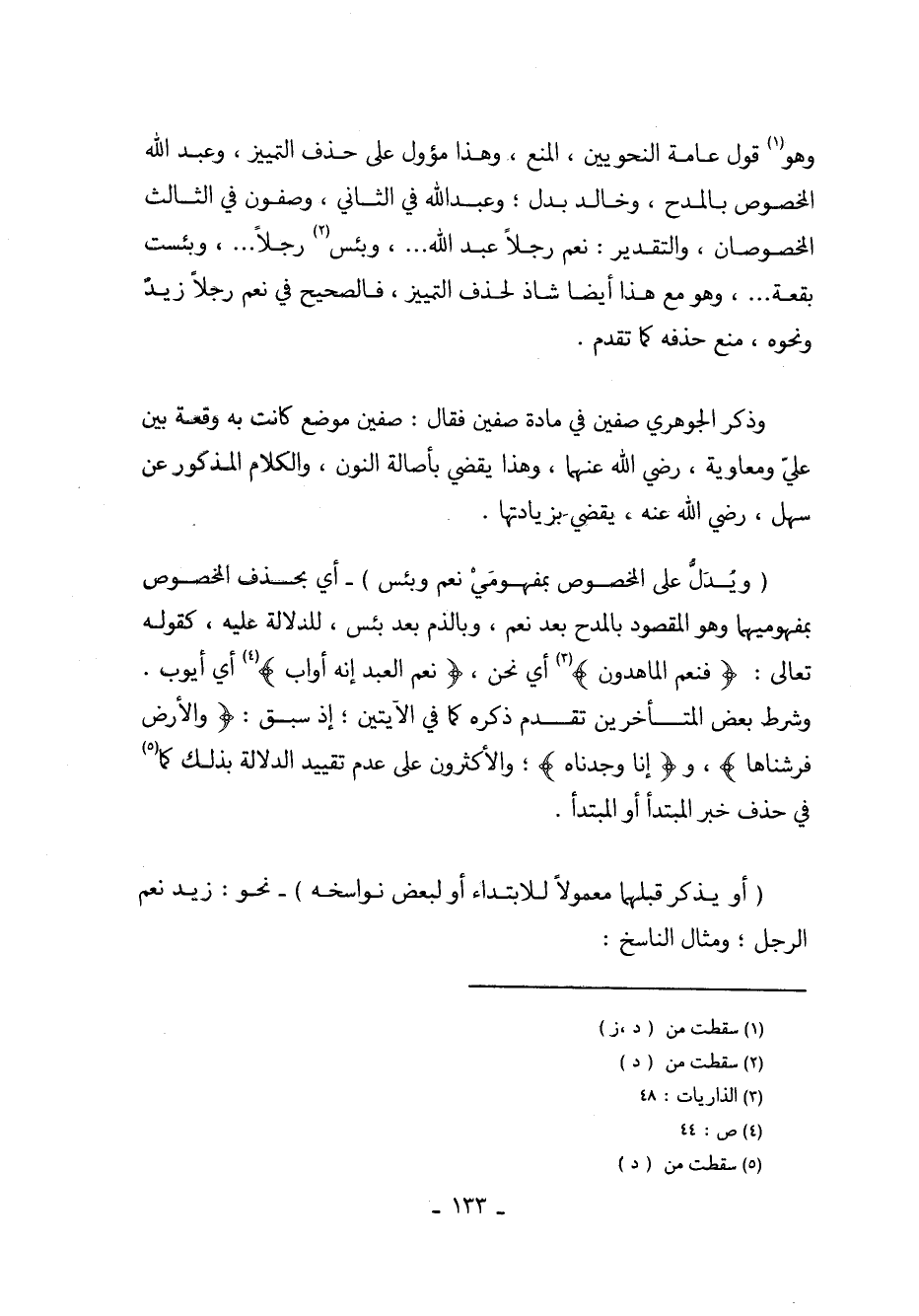 (ويُدل على المخصوص بمفهوميْ نعم وبئس) - أي بحذف المخصوص بمفهوميهما وهو المقصود بالمدح بعد نعم، وبالذم بعد بئس، للدلالة عليه، كقوله تعالى: (فنعم الماهدون) أي نحن، (نعم العبد إنه أواب) أي أيوب. وشرط بعض المتأخرين تقدم ذكره كما في الآيتين؛ إذ سبق: (والأرض فرشناها)، و (إنا وجدناه)؛ والأكثرون على عدم تقييد الدلالة بذلك كما في حذف خبر المبتدأ أو المبتدأ.