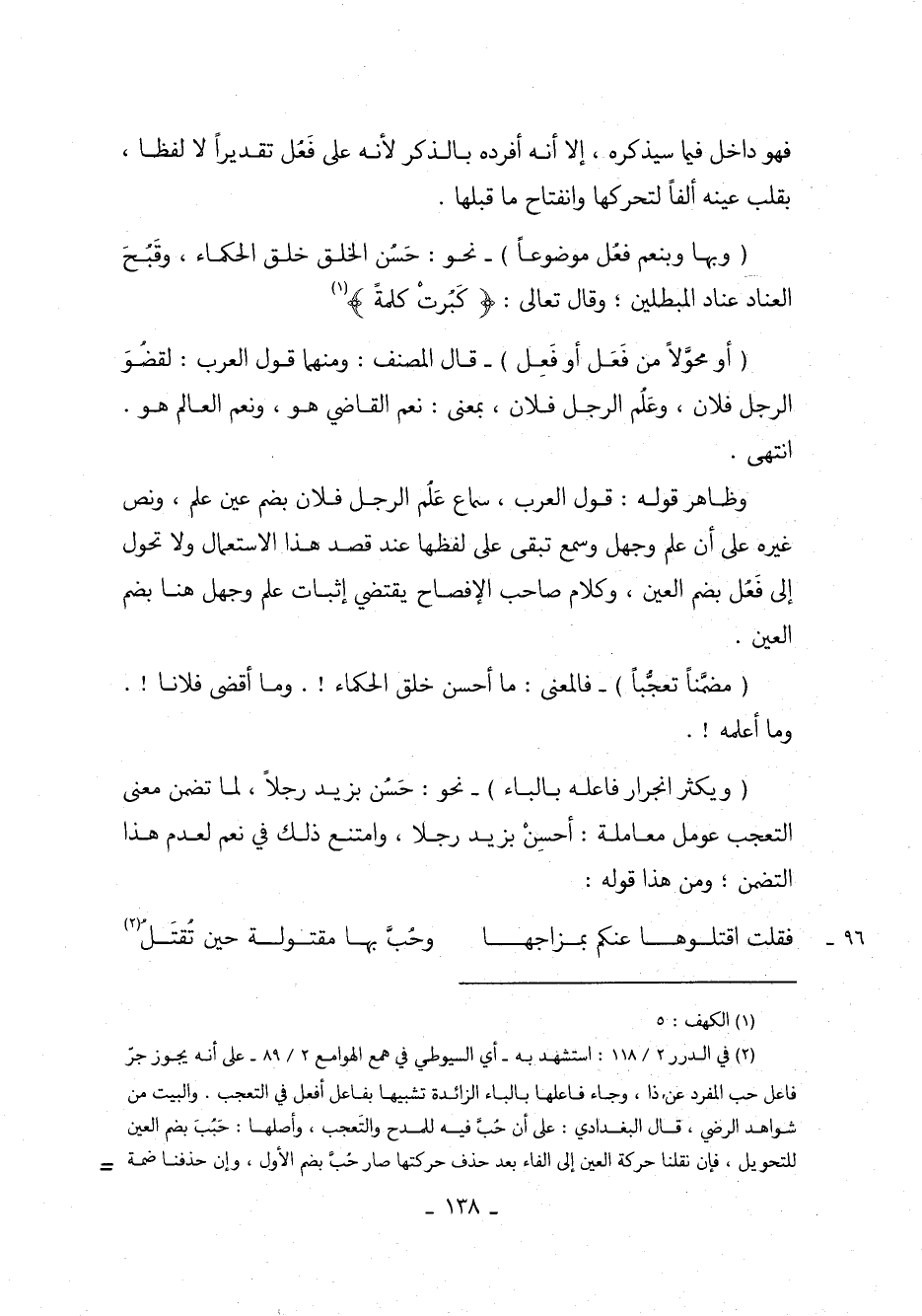 (وبها وبنعم فعُل موضوعاً) - نحو: حَسُن الخلق خلق الحكماء، وقَبُح العناد عناد المبطلين؛ وقال تعالى: (كبُرتْ كلمةً).