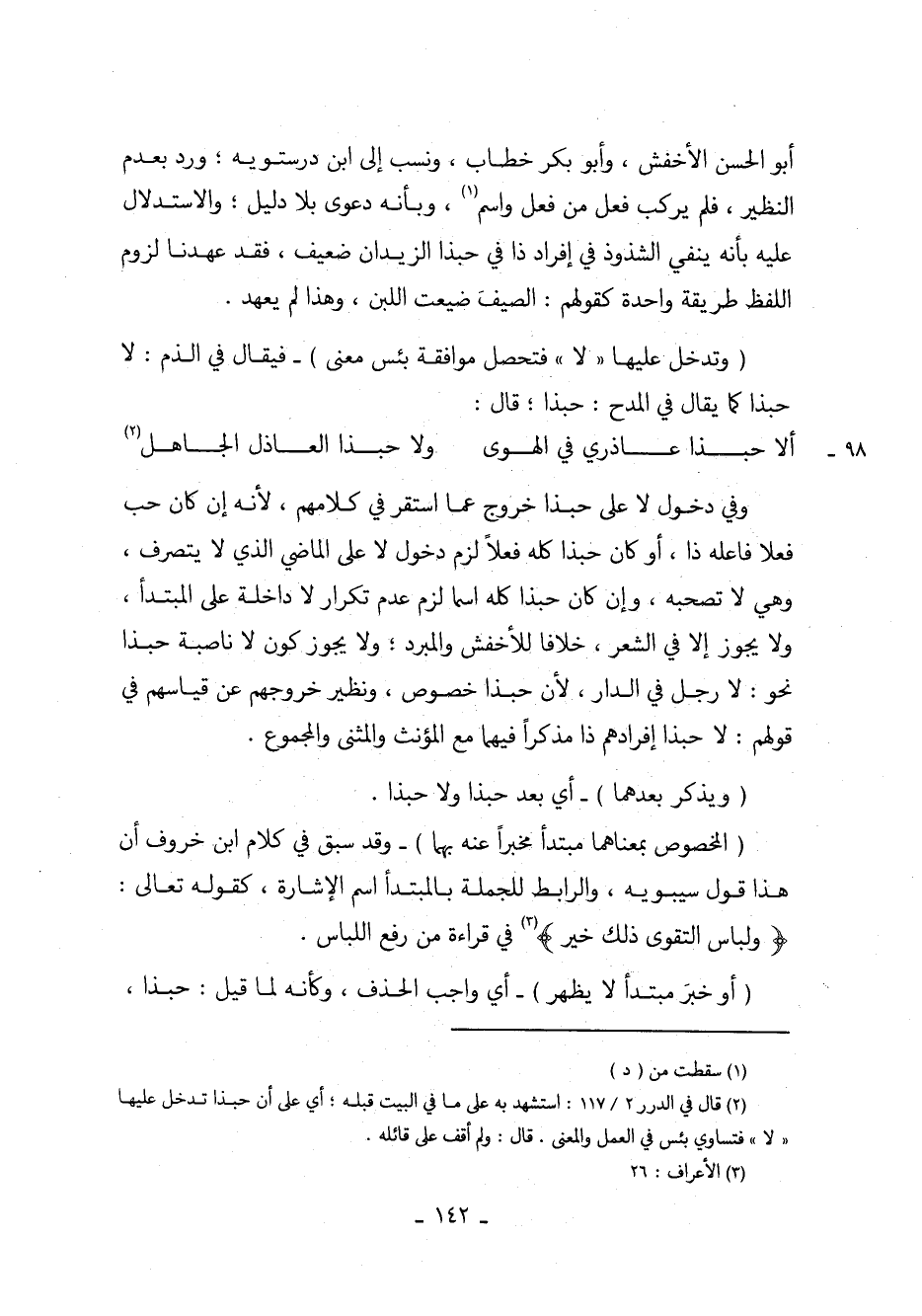 وفي دخول لا على بذا خروج عما استقر في كلامهم، لأنه إن كان حب فعلاً فاعله ذا، أو كان حبذا كله فعلاً لزم دخول لا على الماضي الذي لا يتصرف، وهي لا تصحبه، وإن كان حبذا كله اسما لزم عدم تكرار لا داخلة على المبتدأ، ولا يجوز إلا في الشعر، خلافاً للأخفش والمبرد؛ ولا يجوز كون لا ناصبة حبذا نحو: لا رجل في الدار، لأ حبذا خصوص، ونظير خروجهم عن قياسهم في قولهم: لا حبذا إفرادهم ذا مذكراً فيهما مع المؤنث والمثنى والمجموع.