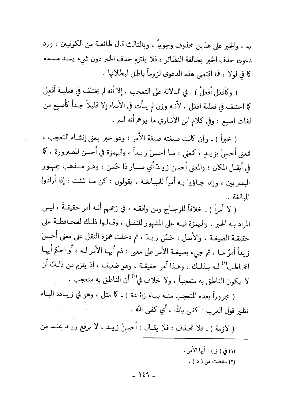 (خبراً) - وإن كانت صيغته صيغة الأمر؛ وهو خبر بمعنى إنشاء التعجب، فمعنى أحسِنْ بزيدٍ، كمعنى: ما أحسن زيداً، والهمزة في أحسن للصيرورةن كما في أبقل المكان؛ والمعنى أحسن زيد أي صار ذا حُسن؛ وهو مذهب جمهور البصريين، وإنما جاؤوا به أمراً للمبالغة، يقولون: كن ما شئت؛ إذا أرادوا المبالغة.