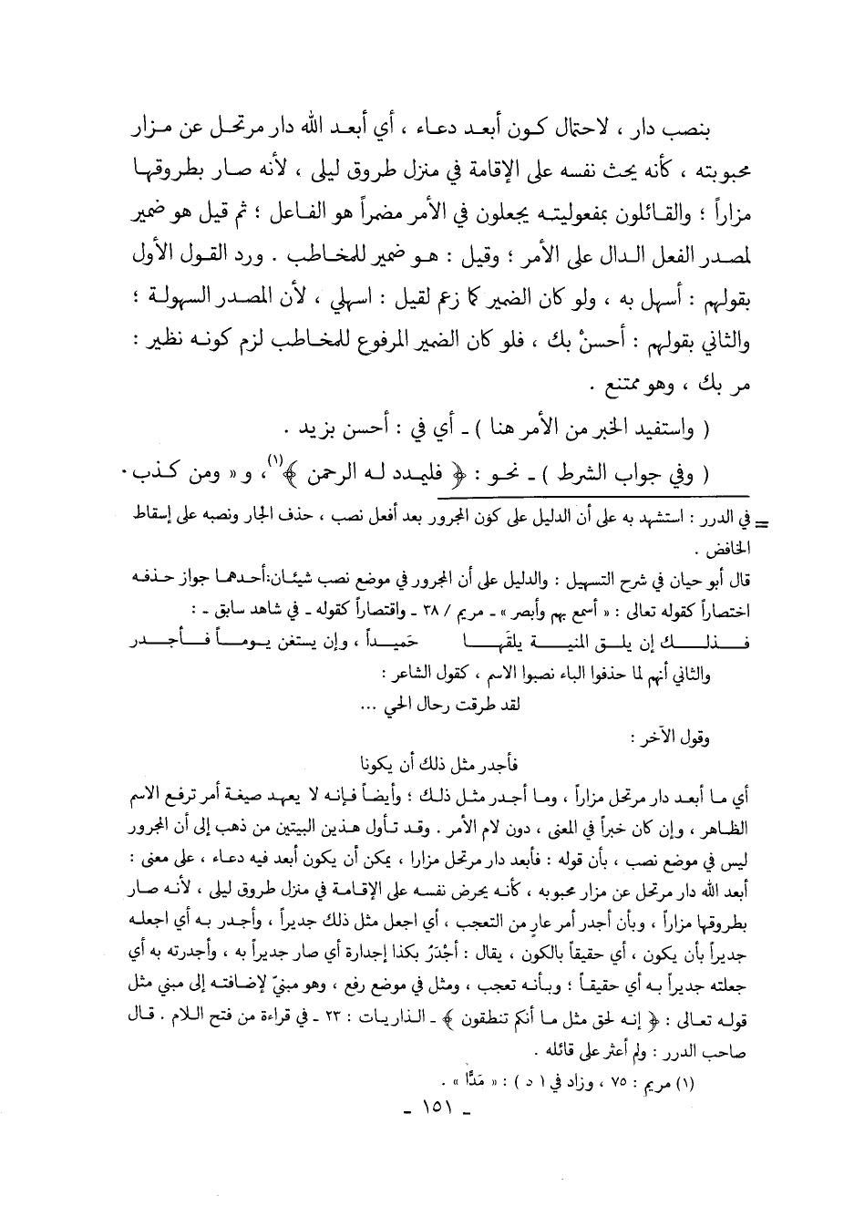 بنصب دار، لاحتمال كون أبعد دعاء، أي أبعد الله دار مرتحل عن مزار محبوبته، كأنه يحث نفسه على الإقامة في منزل طروق ليلى، لأنه صار بطروقها مزاراً؛ والقائلون بمفعوليته يجعلون في الأمر مضمراً هو الفاعل؛ ثم قيل هو ضمير لمصدر الفعل الدال على الأمر؛ وقيل: هو ضمير للمخاطب. ورد القول الأول بقولهم: أسهل به، ولو كان الضمير كما زعم لقيل: اسهلي، لأن المصدر السهولة؛ والثاني بقولهم: أحسنْ بك، فلو كان الضمير المرفوع للمخاطب لزم كونه نظير: مر بك، وهو ممتنع.