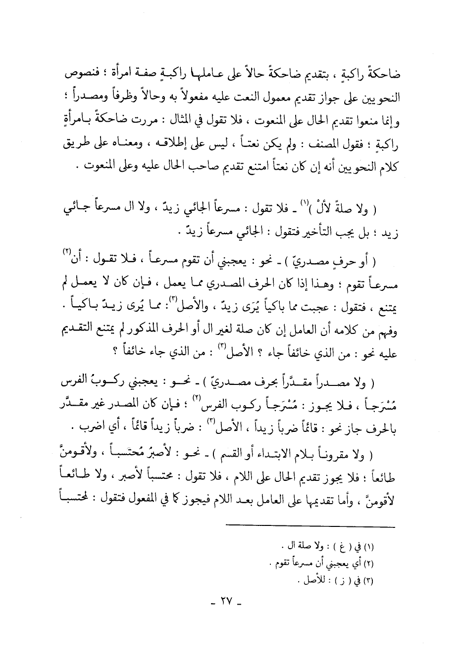 ضاحكةً راكبةٍ، بتقديم ضاحكةً حالاً على عاملها راكبةٍ صفة امرأة؛ فنصوص النحويين على جواز تقديم معمول النعت عليه مفعولاً به وحالاً وظرفاً ومصدراً؛ وإنما منعوا تقديم الحال على المنعوت، فلا تقول في المثال: مررت ضاحكةً بامرأةٍ راكبةٍ؛ فقول المصنف: ولم يكن نعتاً، ليس على إطلاقه، ومعناه على طريق كلام النحويين أنه إن كان نعتاً امتنع تقديم صاحب الحال عليه وعلى المنعوت.