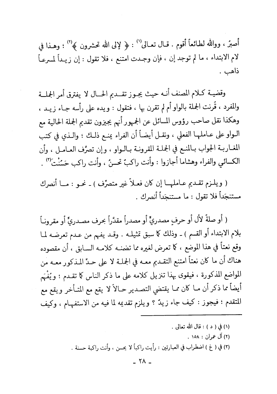 (أو صلةً لأل أو حرفٍ مصدري أو مصدراً مقدراً بحرف مصدري أو مقروناً بلام الابتداء أو القسم) - وذلك كما سبق تمثيله. وقد يفهم من عدم تعرضه لما وقع نعتاً في هذا الموضع، كما تعرض لغيره مما تضمنه كلامه السابق، أن مقصوده هناك أن ما كان نعتاً امتنع التقديم معه في الجملة لا على حد المذكور معه من المواضع المذكورة، فيقوى بهذا تنزيل كلامه على ما ذكر الناس كما تقدم؛ ويُفهم أيضاً مما ذكر أن ما كان مما يقتضي التصدير حالاً لا يقع مع المتأخر ويقع مع المتقدم؛ فيجوز: كيف جاء زيدٌ؟ ويلزم تقديمه لما فيه من الاستفهام، وكيف