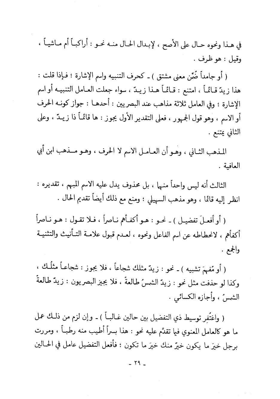 (أو جامداً ضُمن معنى مشتق) - كحرف التنبيه واسم الإشارة؛ فإذا قلت: هذا زيدٌ قائماً، امتنع: قائماً هذا زيدٌ، سواء جعلت العامل التنبيه أو اسم الإشارة؛ وفي العامل ثلاثة مذاهب عند البصريين: أحدها: جواز كونه الحرف أو الاسم، وهو قول الجمهور، فعلى التقدير الأول يجوز: ها قائماً ذا زيدٌ، وعلى الثاني يمتنع.