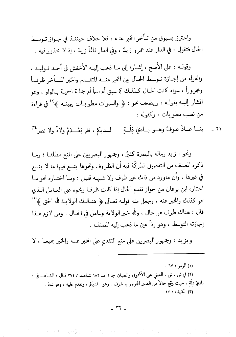 ونحو: زيد وماله بالبصرة كثيرٌ، وجمهور البصريين على المنع مطلقاً؛ وما ذكره المصنف من التفصيل مَدْركُهُ فيه أن الظروف ونحوها يتسع فيها ما لا يتسع في غيرها، وأن ما ورد من ذلك غير ظرف ولا شبهه قليل؛ وما اختاره نحو ما اختاره ابن برهان من جواز تقدم الحال إذا كانت ظرفاً ونحوه على العامل الذي هو كذلك والمخبر عنه، وجعل منه قوله تعالى: (هنالك الولاية لله الحق) قال: هناك ظرف هو حال، ولله خبر الولاية وعامل في الحال. ومن لازم هذا إجازته التوسط، وهو إذاً عين ما ذهب إليه المصنف.