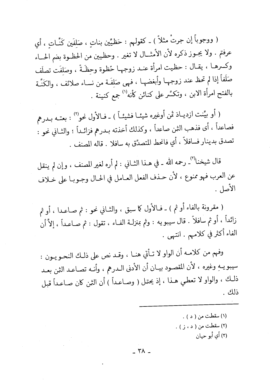 (أو بينت ازدياد ثمن أو غيره شيئاً فشيئاً) - فالأول نحو: بعته بدرهم فصاعداً، أي فذهب الثمن صاعداً، وكذلك أخذته بدرهم فزائداً؛ والثاني نحو: تصدق بدينار فسافلاً، أي فانحط المتصدق به سافلاً. قاله المصنف.
