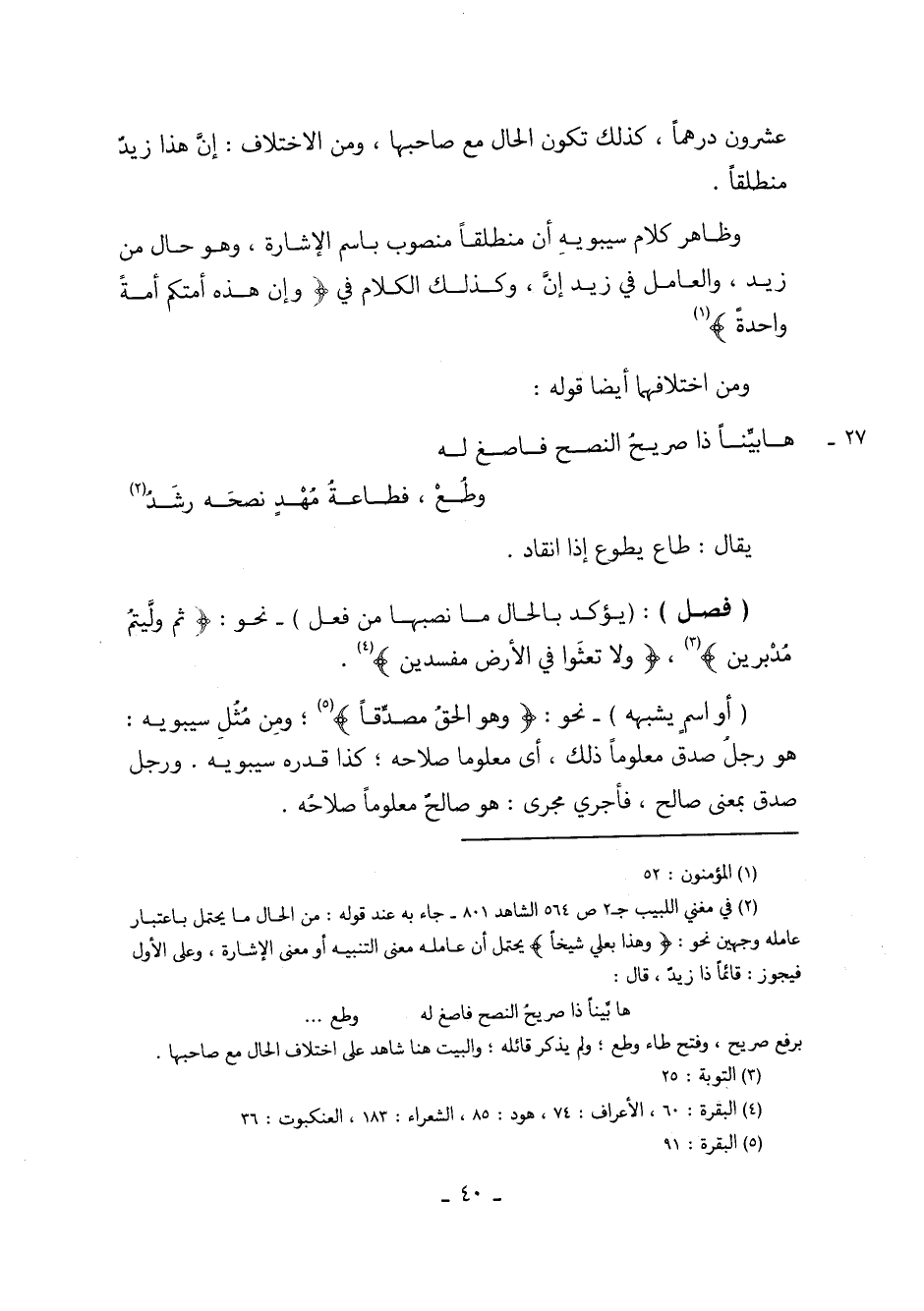 عشرون درهماً، كذلك تكون الحال مع صاحبها، ومن الاختلاف: إن هذا زيدٌ منطلقاً.