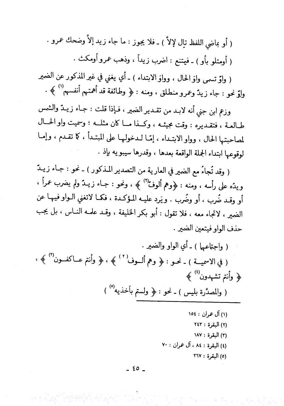 (وقد تُجاءُ مع الضمير في العارية من التصدير المذكور) - نحو: جاء زيدٌ ويدُه على رأسه، ومنه: (وهم ألوف)، ونحو: جاء زيدٌ ولم يضرب عمراً، أو وقد ضُرب، أو وُضرب. ويرد عليه المؤكدة، فكما لا تغني الواو فيها عن الضمير، لاتجاء معه، فلا تقول: أبو بكر الخليفة، وقد علمه الناس، بل يجب حذف الواو فيتعين الضمير.