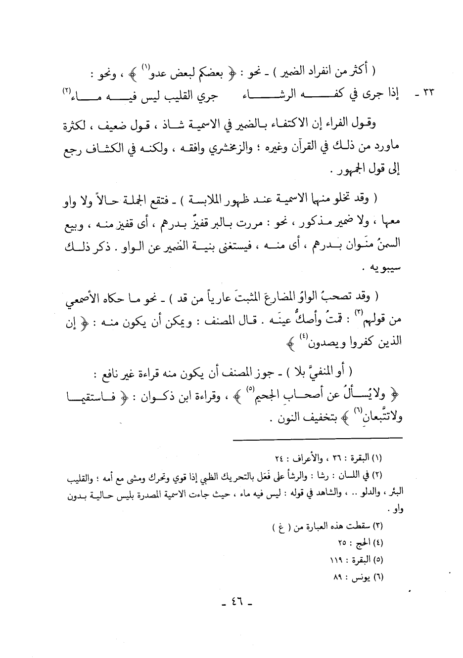 وقول الفراء إن الاكتفاء بالضمير في الاسمية شاذ، قول ضعيف، لكثرة ما ورد من ذلك في القرآن وغيره؛ والزمخشري وافقه، ولكنه في الكشاف رجع إلى قول الجمهور.