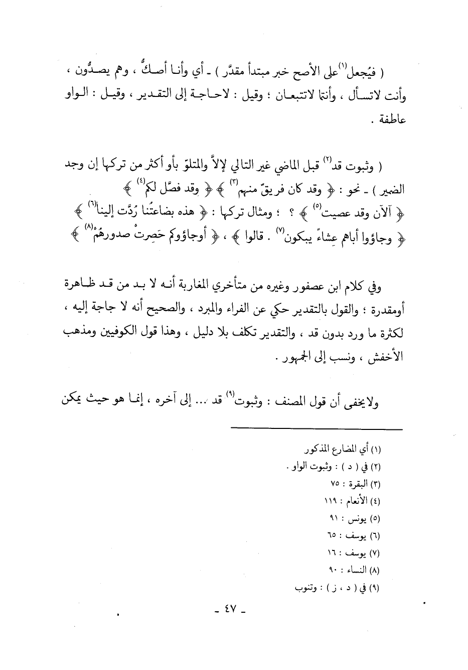 (وثبوت قد قبل الماضي غير التالي لإلا والمتلو بأو أكثر من تركها إن وجد الضمير) - نحو: (وقد كان فريق منهم) (وقد فصل لكم) (الآن وقد عصيت)؟ ؛ ومثال تركها: (هذه بضاعتُنا ردت إلينا) (وجاؤوا أباهم عشاء يبكون. قالوا)، (أو جاؤوكم حصرتْ صدورهم).