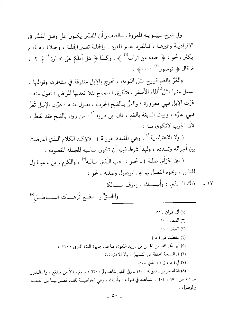 وفي شرح سيبويه المعروف بالصفار أن المفسر يكون على وفق المفسر في الإفرادية وغيرها، فالمفرد يفسر المفرد، والجملة تفسر الجملة، وخلاف هذا لم يكثر، نحو: (خلقه من تراب)، وكذا (هل أدلكم على تجارة)؟ ، ثم قال (تؤمنون ... ).