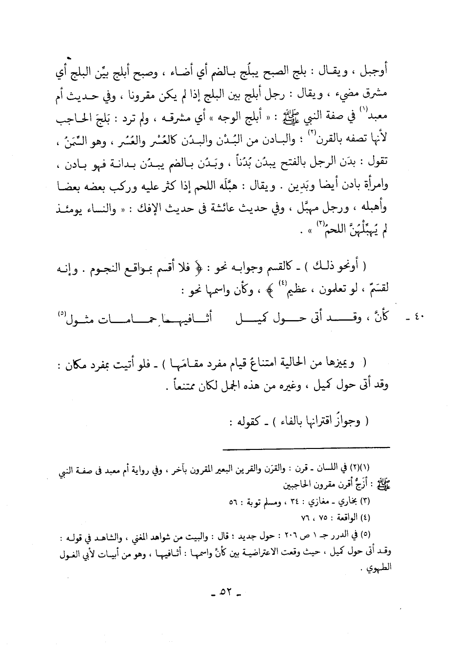 أو جبل، ويقال: بلج الصبح يبلُج بالضم أي أضاء، وصبح أبلج بين البلج أي مشرق مضيء، ويقال: رجل أبلج بين البلج إذا لم يكن مقروناً، وفي حديث أم معبد في صفة النبي صلى الله عليه وسلم: "أبلج الوجه" أي مشرقه، ولم ترد: بَلجَ الحاجب لأنها تصفه بالقرن: والبادن من البُدْن والبدُن كالعُسْر والعُسُر، وهو السمنُ، تقول: بدن الرجل بالفتح يبدُن بُدُناً، وبَدُن بالضم يبدُن بدانة فهو بادن، وامرأة بادن أيضاً وبدين. ويقال: هبله اللحم إذا كثر عليه وركب بعضه بعضاً وأهبله، ورجل مهبل، وفي حديث عائشة في حديث الإفك: "والنساء يومئذ لم يُهبِّلْهُنَّ اللحمُ".