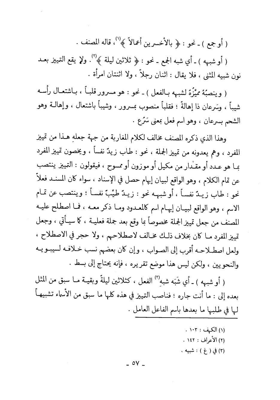 (أو شبهه) - أي شبه الجمع- نحو: (ثلاثين ليلة). ولا يقع التمييز بعد نون شبيه المثنى، فلا يقال: اثنان رجلاً، ولا اثنتان امرأة.