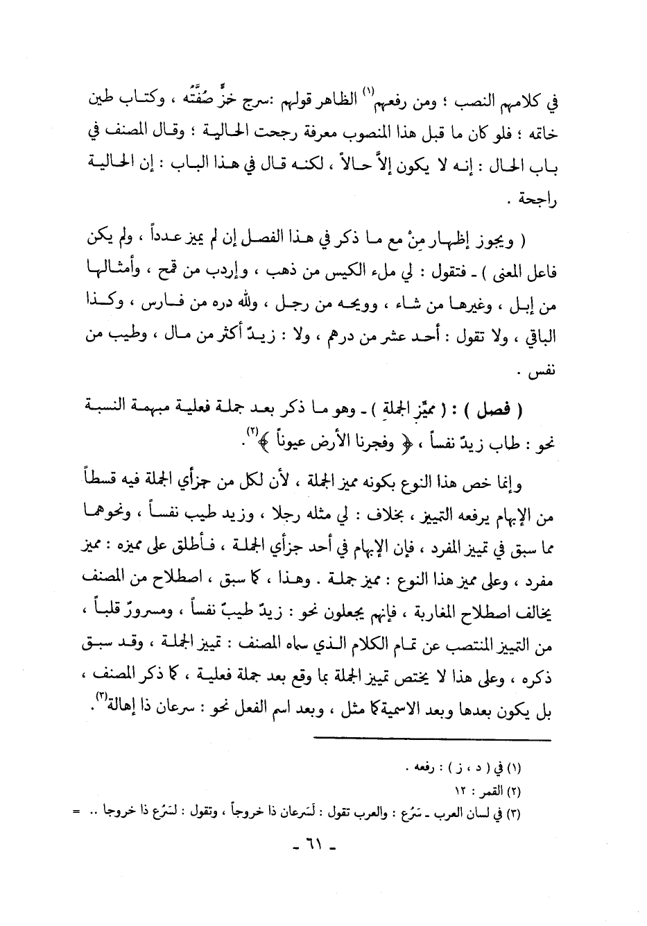 (فصل): (مميز الجملة) - وهو ما ذكر بعد جملة فعلية مبهمة النسبة نحو: طاب زيدٌ نفساً، (وفجرنا الأرض عيوناً).