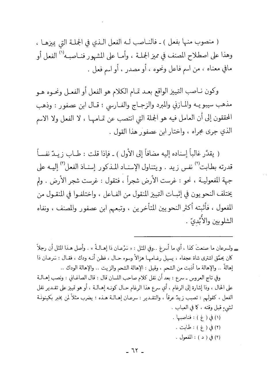 (يقدر غالباً إسناده إليه مضافاً إلى الأول) - فإذا قلت: طاب زيدٌ نفساً قدرته بطابت نفس زيد. ويتناول الإسناد المذكور إسناد الفعل إليه على جهة المفعولية، نحو: غرست الأرض شجراً، فتقول: غرست شجر الأرض. ولم يختلف النحويون في إثبات التمييز المنقول من الفاعل، واختلفوا في المنقول من المفعول، فأثبته أكثر النحويين المتأخرين، وتبعهم ابن عصفور والمصنف، ونفاه الشلوبين والأُبَّدِي.