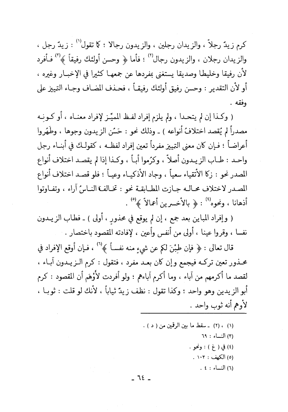 قال تعالى: (فإن طِبنَ لكم عن شيءٍ منه نفساً)، فإن أوقع الإفراد في محذور تعين تركه فيجمع وإن كان بعد مفرد، فتقول: كرم الزيدون آباء، لقصد ما أكرمهم من آباء، وما أكرم آباءهم؛ ولو أفردت لأوْهَم أن المقصود: كرم أبو الزيدين وهو واحد؛ وكذا تقول: نظف زيدٌ ثياباً، لأنك لو قلت: ثوباً، لأوهم أنه ثوب واحد.